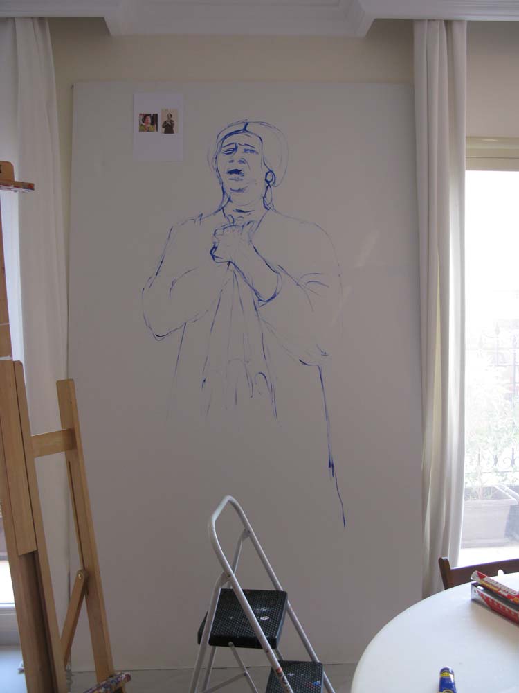 I FINALLY started this painting. It’s been a long time coming now. I listened to some her music, watched some videos on youtube and printed some photos. I avoided the sunglasses because of two reasons: the first is that it’s been overdone and somehow the glasses came to represent her more than her voice. Secondly is: I’m a bit of a masochist. I think that I can accomplish it without the iconic glasses because I have faith in myself (crossing my fingers, mashallah mashallah mashallah and hope to die [rather, NOT to die]) and I like to give myself a bit of a challenge. Mind you the hanky is still there. My eleven year old son recognized the sketch as Um Kulthum. My daughter thought it was Mama Fatma (my granny).