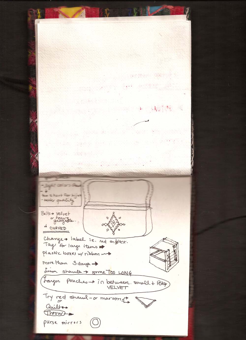 inside i found some notes on new ideas for the palestinian culture center embroidered pieces. this was years ago and some have come to fruition. but probably without my influence because i don't think i showed them to anyone