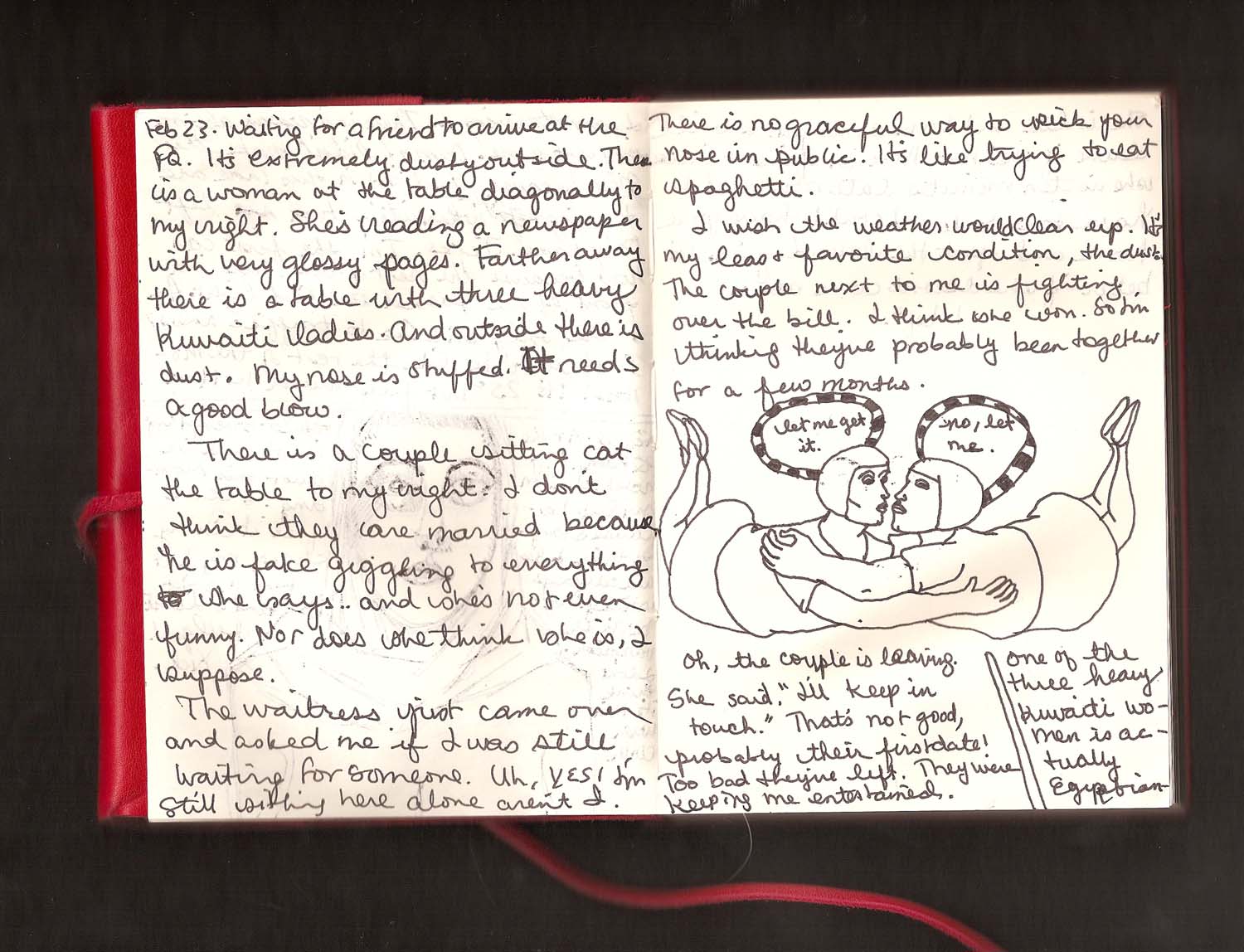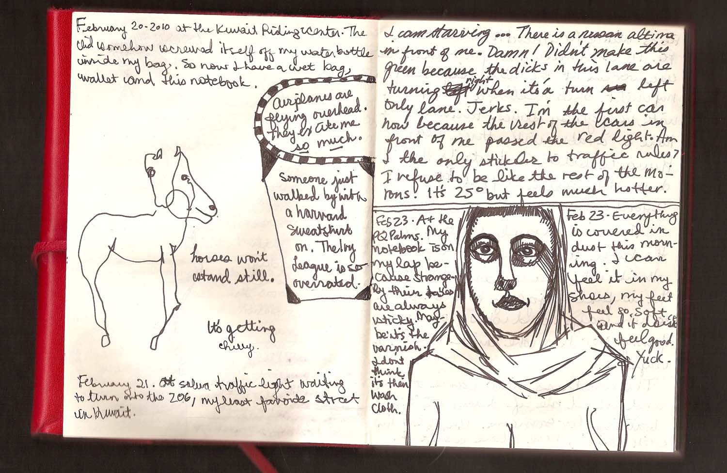 Category: The Book of Traffic Lights & Other Observations Tags: book, horses, ink, Kuwait, notes, observations, pq, restaurant, sketch, tolerance, traffic, waiting