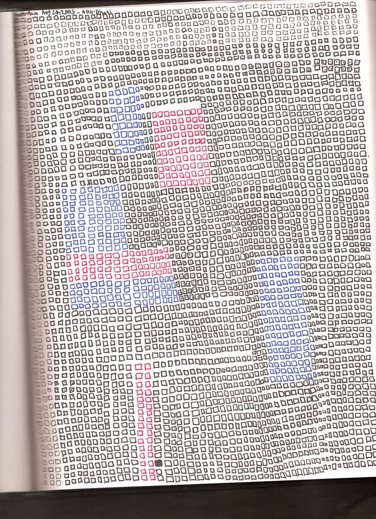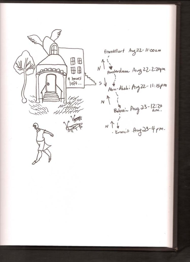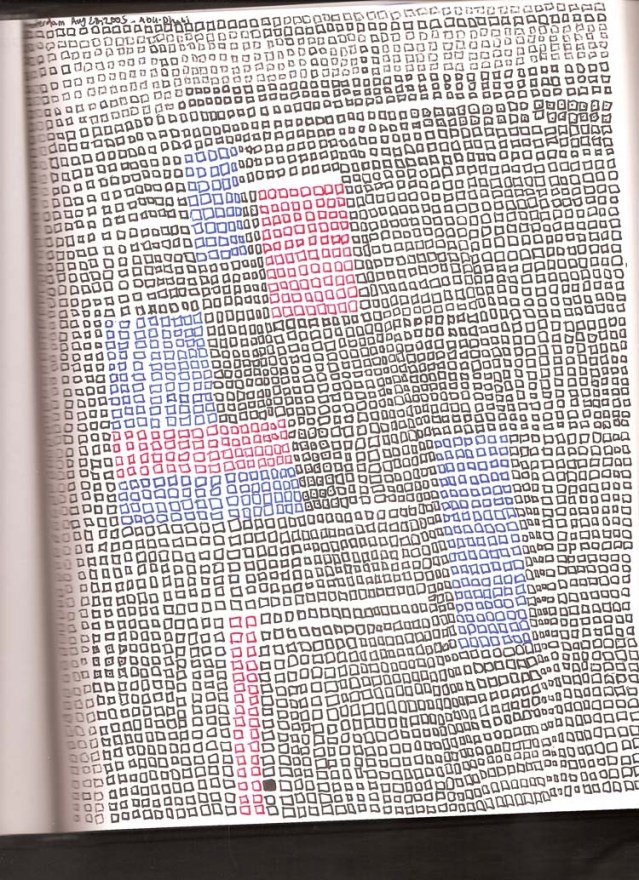 What was supposed to be a simple flight from Frankfurt to Kuwait turned into a nightmarish Juha-like trip which spanned three days. All thanks to the incompetence of our then travel agents. I was traveling with my ex-husband and three children, first to Amsterdam and then a road/train trip around Germany. A few days before our trip back to Kuwait, we luckily learned (to our horror nonetheless) that our flight back had been cancelled. So our revised and far-less-than-improved itinerary became as such: Frankfurt, north to Amsterdam, south to Abu-Dhabi, north to Bahrain, and then north again to Kuwait. The sketch above is the first incident of my square fixation. I was drawing the squares in a tantric-like state, from Amsterdam to Abu-Dhabi. I soon started a small sketchbook dedicated to just squares, page after page. I lost that book.