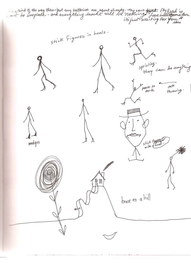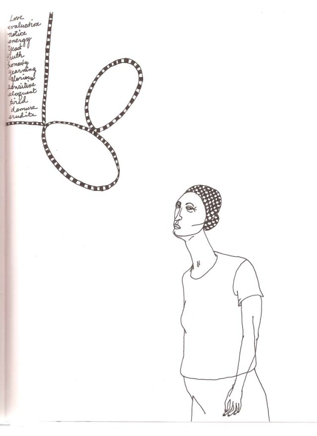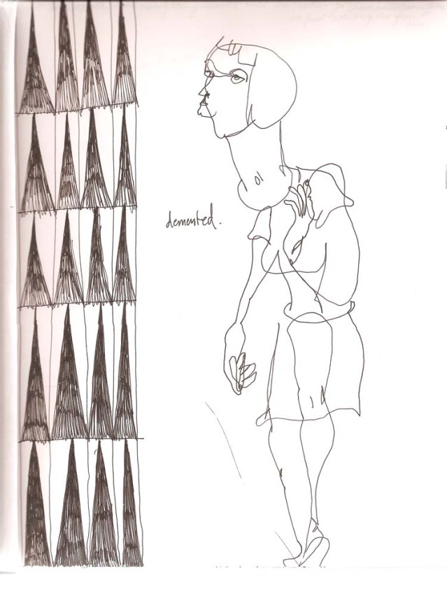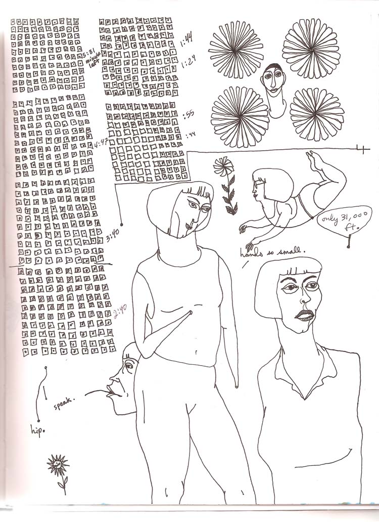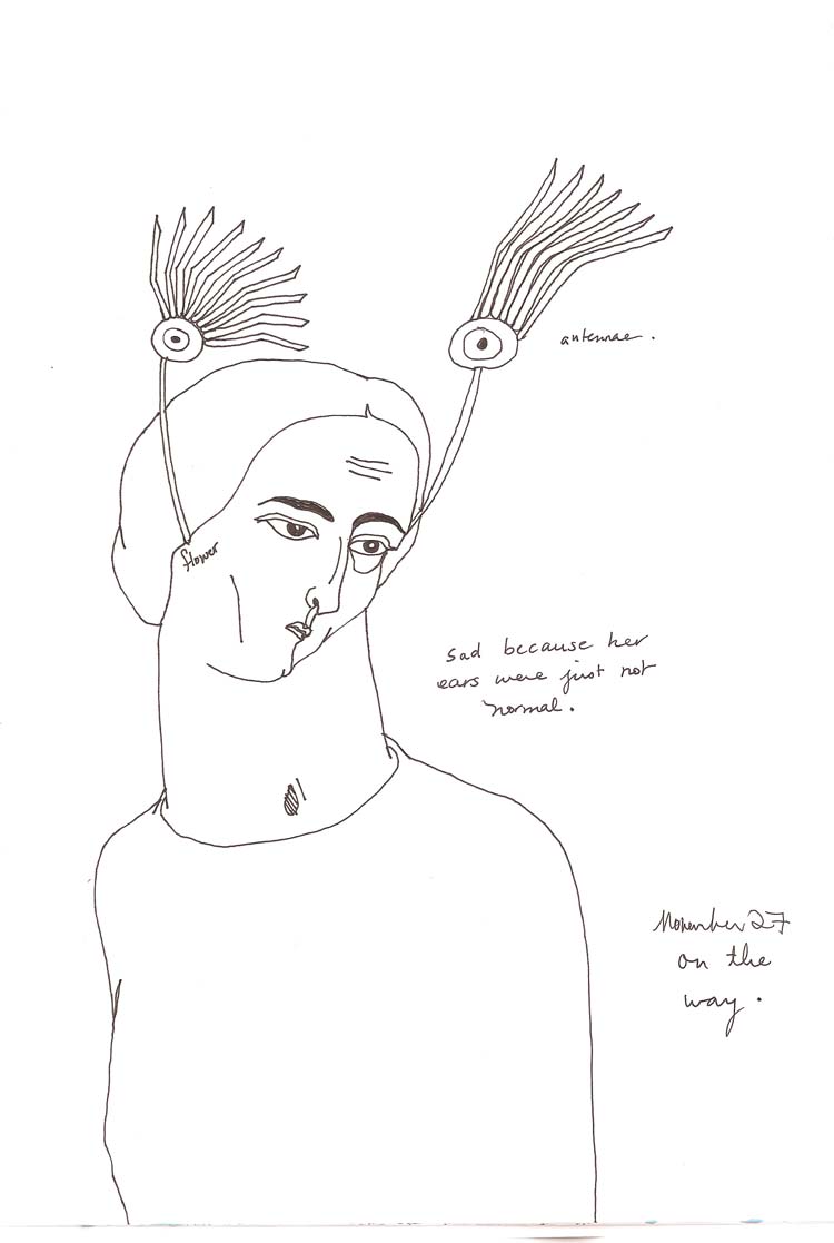 These were done on board Kuwait Airways in late 2006. I was flying with Amira Behbehani (to my left) and Thuraya Al-Baqsami (on my right). We were en route to Paris for a group show at the Institut Du Monde Arabe (also with us was Suhaila Al-Najdi sitting in Business Class the lucky duck). It must have been one of the most unpleasant daytime flights ever. The cabin crew had asked passengers to draw the window blinds and turned off all lights. Thuraya was really funny because she wasn’t going to take it sitting down. She finally asked-well, told-the flight attendant that she knew what they were up to; that they wanted the passengers to be asleep throughout the flight so that they didn’t have to worry about serving us! Soon after her complaint, the lights were all on again and people were starting to wake up from their siestas. The drawings I’ve included here are a fraction of the ones I drew on that plane. I started off in an orderly fashion but soon enough I started losing it. I came to a point where it didn’t matter what I drew as long as I kept my hand busy.