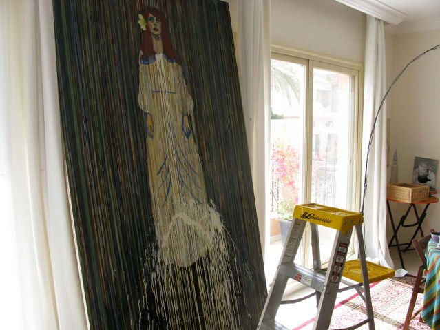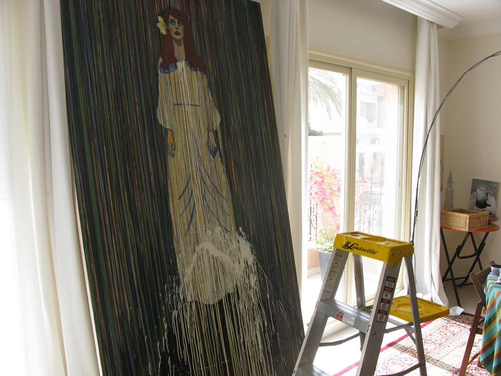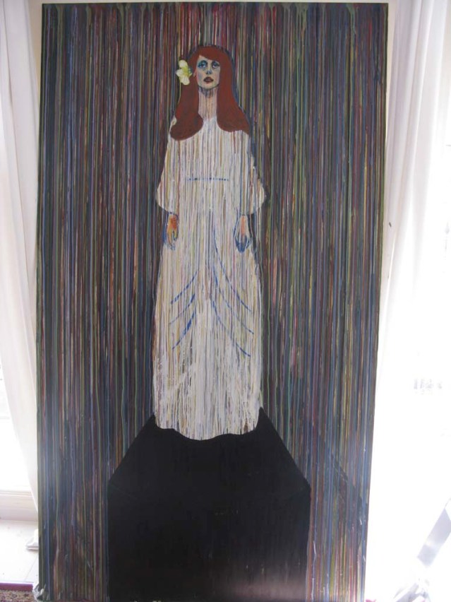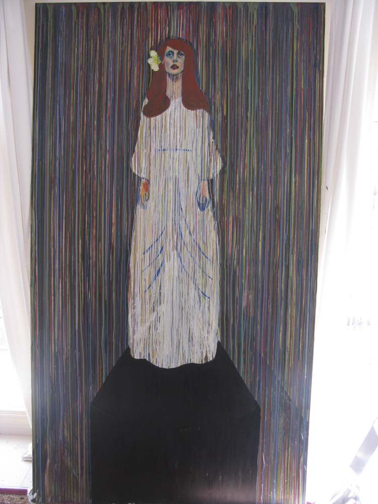 yeah, she was supposed to be floating but i prefer her grounded, and i’ll tell you why: first of all, the painting needs a solid. i just feel it does, there’s no right or wrong. it’s all so drippy and ethereal, i like to keep it balanced with something more concrete and solid. the base, or pedestal, won’t be so black but will remain dark.