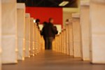 these photos were taken by my brother, mohammed. in this picture is the reflection of the gallery. my son, k, is reading one of the notes. look how neat and organized the bags are. the corkboard is almost bare