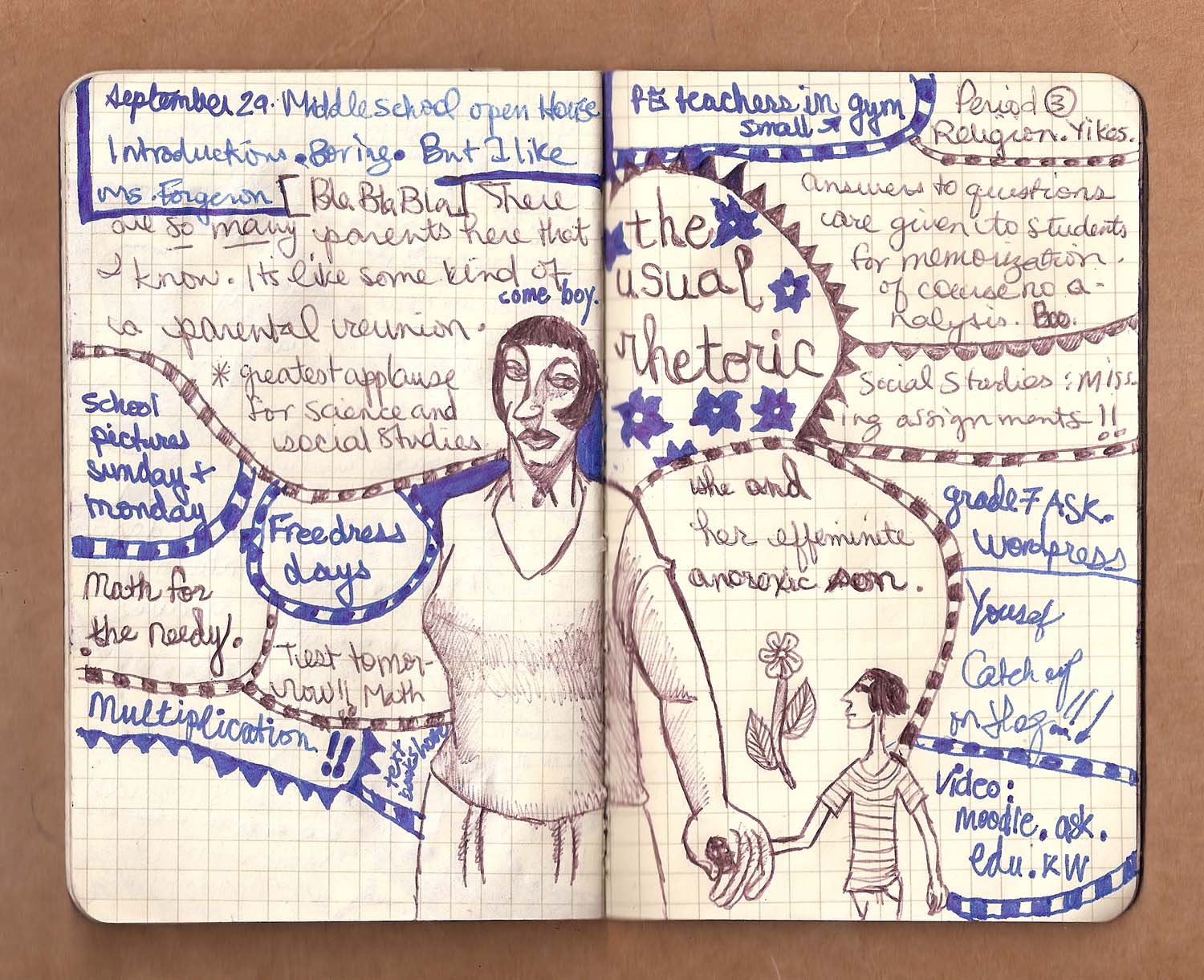 open house is a night for parents to experience a school day in the life of their child. classes normally spread across two days are carved into ten minute sections over a time period of two hours. it’s very undiluted. it’s a night to meet the teachers and discuss syllabuses. but to me, it’s also a night where i am yet again reminded of the difference between the arab method of teaching and the western. and in an american school, not only is the former method out of place, but destroys whatever feeling of wellness and goodness you may have acquired from a previous class. and if i were king of this school, i would obliterate the arabic and religion departments. because what is forced on my children and us parents is a set of demented, poorly illustrated and written, extremely dogmatic books, designed and taught by men and women who have no idea what real life in the 21st century is.
