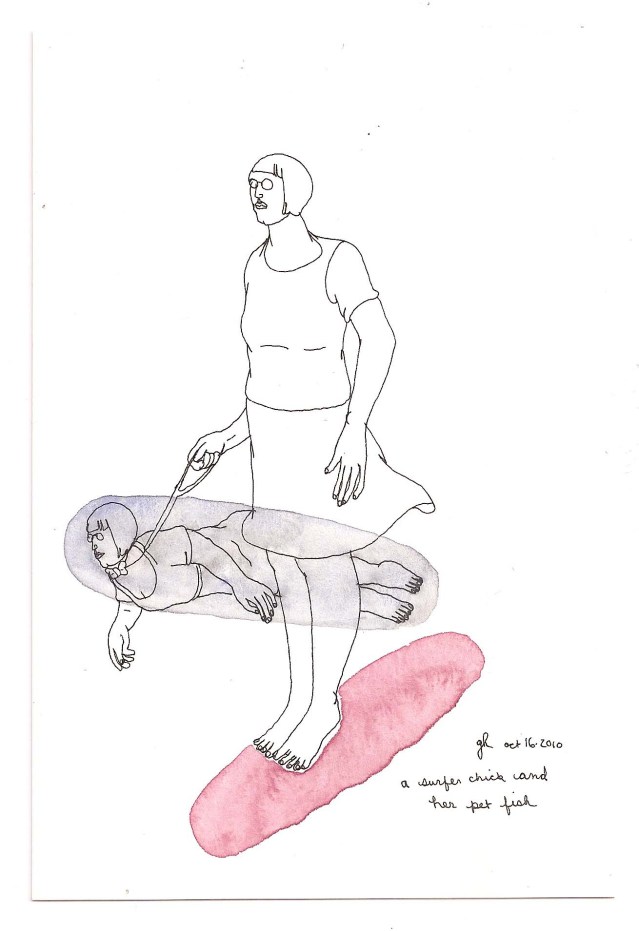 Category: Postcards, The Surfer Chick Episodes, Watercolor Tags: board, fish, ink, isograph, Kuwait, pen, surf, surfer chick