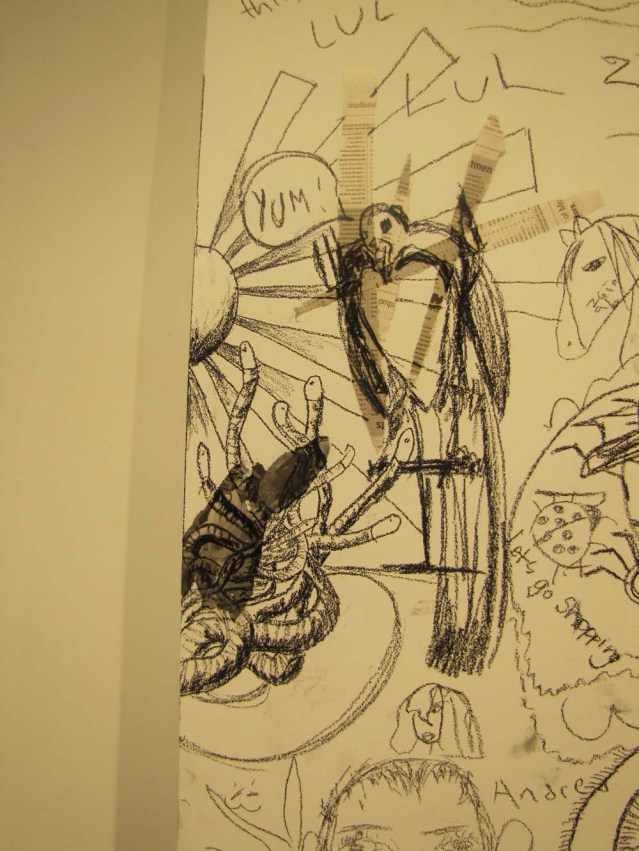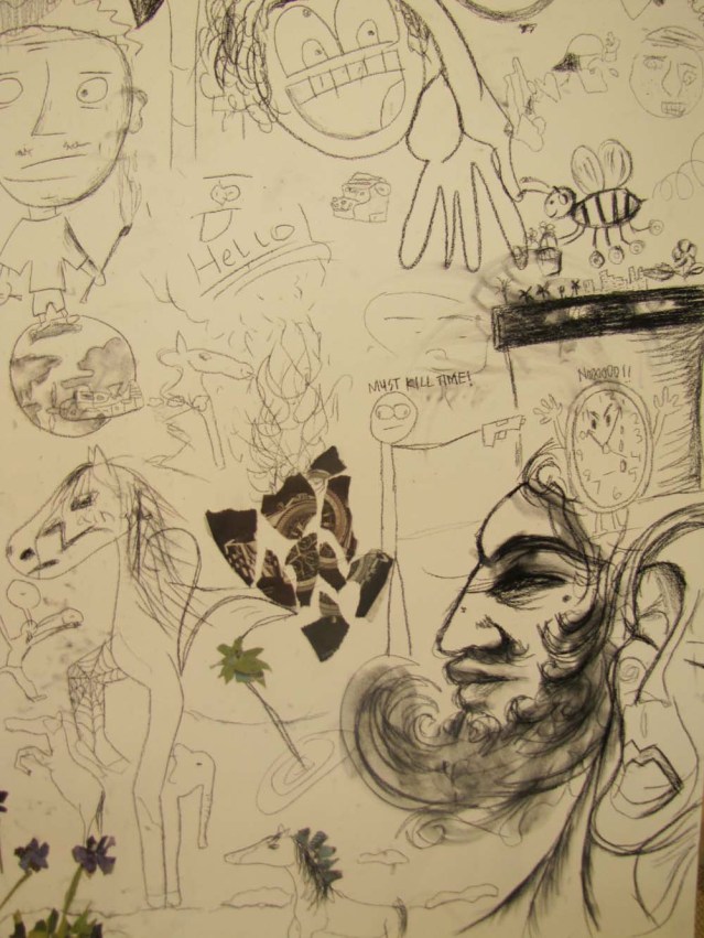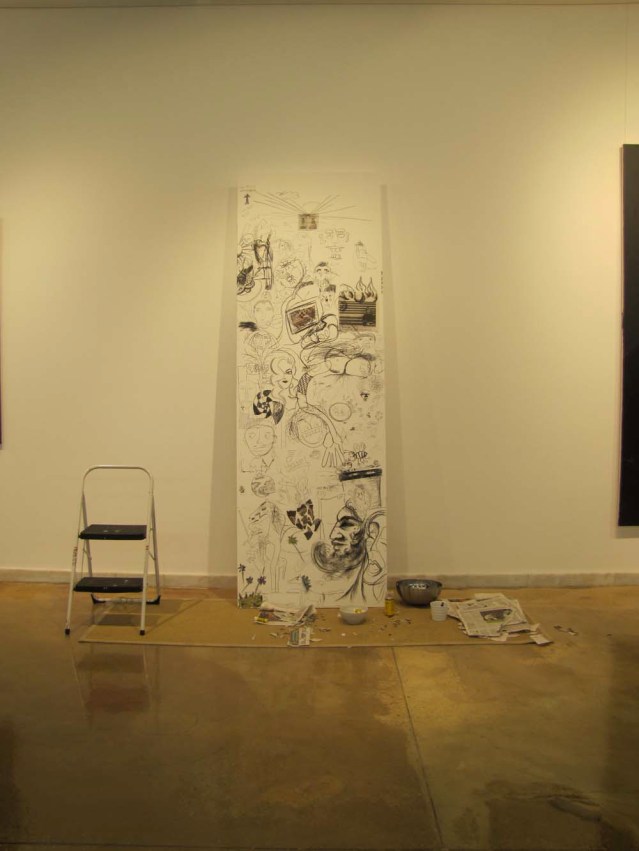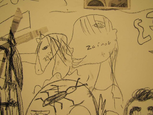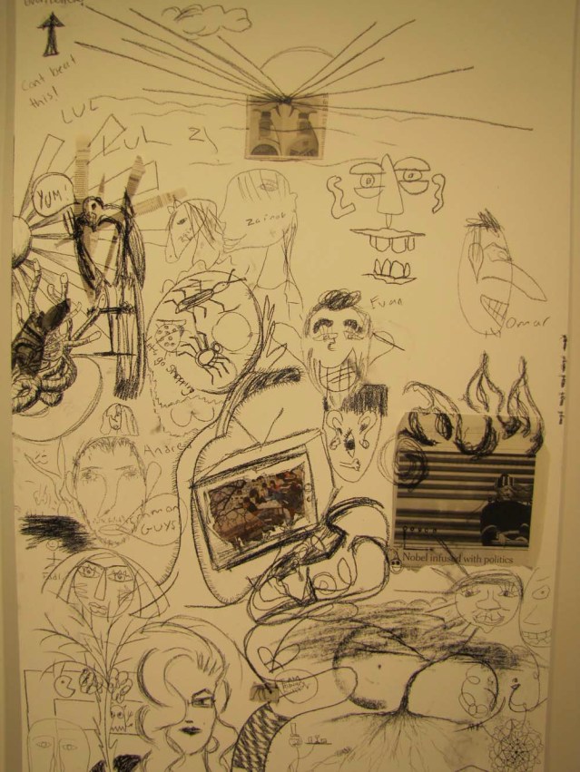 Because I’m always showing videos and slideshows of my works in progress, I thought it would be a good idea to turn the tables and photograph others and their creative processes. So I set up a little work station and let people do their thing. Artists include Yasmeen Dimashkie, Yousef Abu-Ghazaleh, Khaled Abu-Ghazaleh, Zainab Abu-Ghazaleh, Omar Dimashkie, his friends Andrew and Evan, Lina Al-Adwani, Ali Sultan, Hamad AlSaab, Thuraya Al-Baqsami, Mai Alnakib, Rania Al-Nakib, Hind Al-Adwani, Hussa Al-Hassawi, Aseel AlYagoub, Sharifa Abdulsalam, Monira Al Qadiri, Mohammed Al-Kouh, Hassan Alkandari, Yasmine Alkandari, Waleed Shaalan, Siba Orabi and Suzan Al-Mutawa. I know there were a couple more who participated, but I didn’t get the names. Thanks, everyone. I love people who cooperate and get into the spirit of things! Cross the bridge for sectioned photos of this piece.