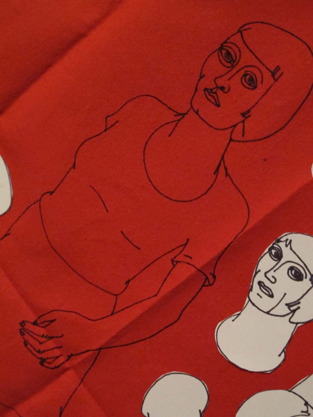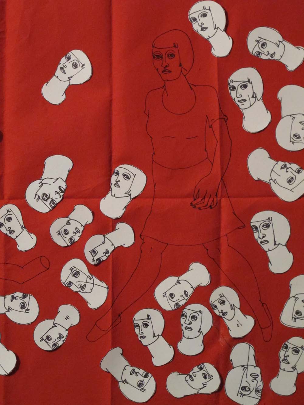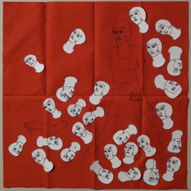 she finds her arm in a flurry of heads: i did this on a napkin i had kept from a summer trip to bern, switzerland. I had a few of these thick, velvety paper napkins, in three colors: red, yellow and green. i've been savoring this last one and now it's not a napkin anymore. which kinda makes me sad