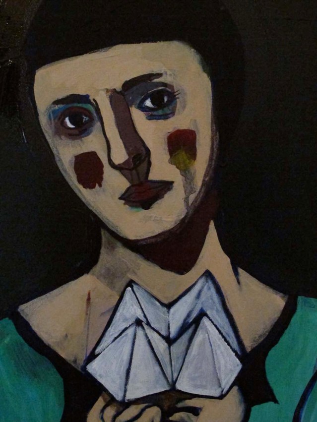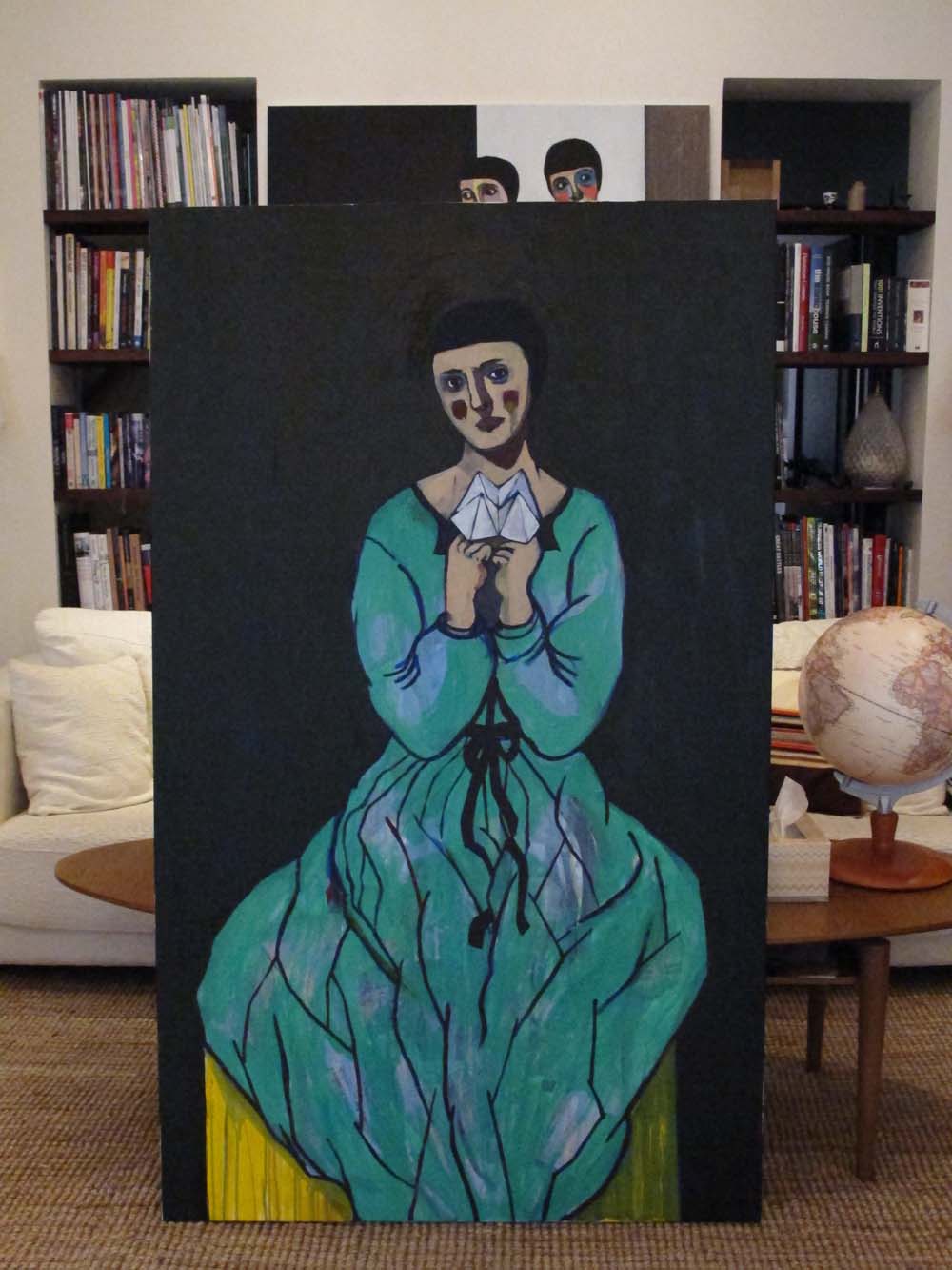 it's pretty cloudy outside, so the lighting in my studio's a bit dim; that's why i couldn't take a proper photo of this painting. once i get these photographed professionally, i'll post it as part of the whole collection. i like this photo because of the two eves peeping from behind!