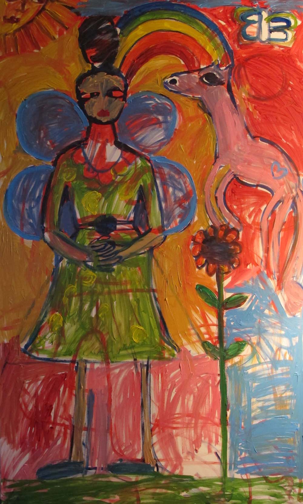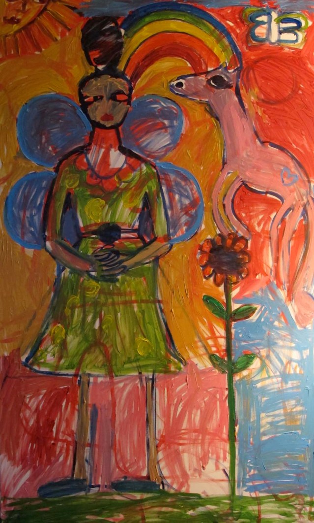 I don’t know if it’s the rain (I do cherish this kind of weather, but perhaps not for too long), or if I miss my children, or I have the misfortune of dealing daily with unprofessional, inconsiderate fuckers, but I’ve been pretty maudlin all day. I don’t think it’s the rain. And at the end of a pretty fruitless morning of driving around and getting nothing constructive done, it just felt natural and necessary to paint a picture. I wanted to do something that was so removed from myself so I started off with some haphazard drawings and somehow ended up channeling my ten-year-old daughter and her happy, innocent drawings.