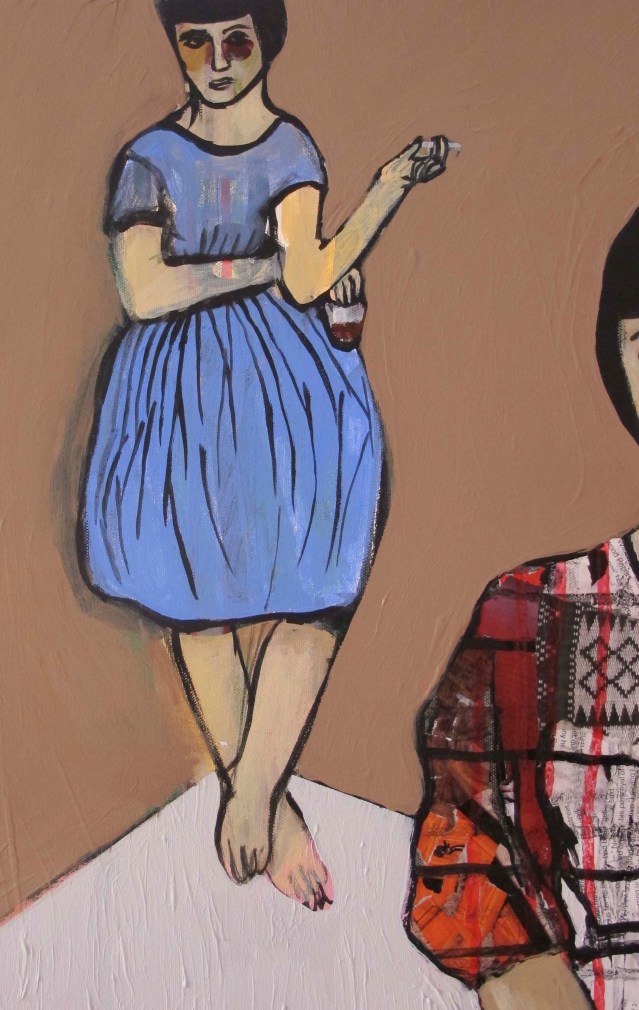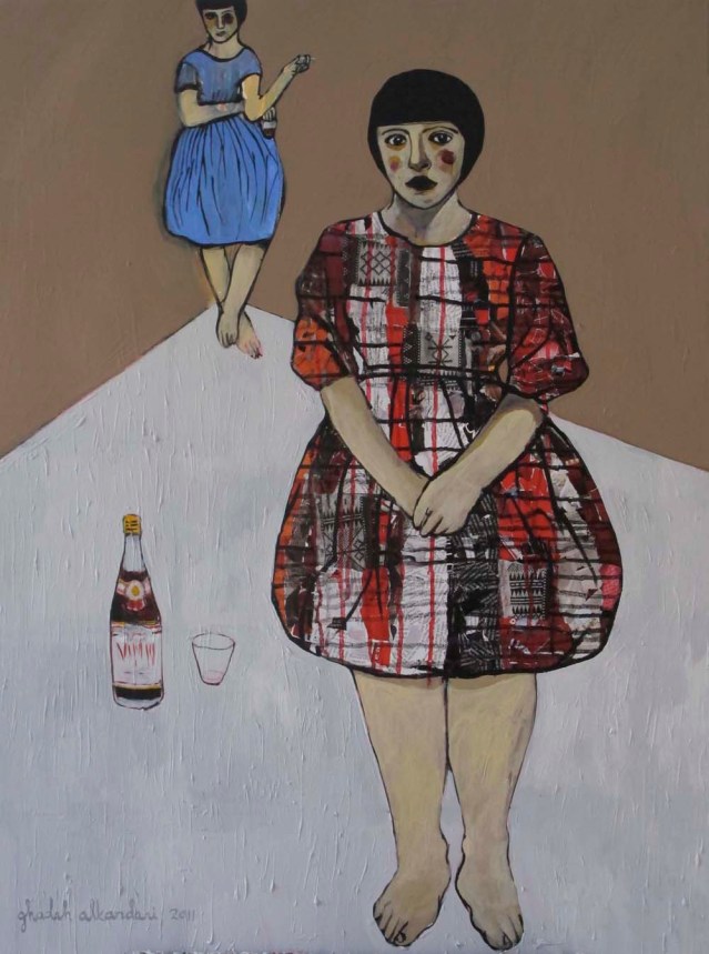 This is a commissioned work I started two days ago and finished this morning. Weeks ago, the request was simple: to paint a picture influenced by Sadu weaving. As simple as my goal was, I found myself floundering under the weight of the original painting I started for the job. It just wasn’t working out for me. I decided to go with the flow of where that one was taking me and start afresh with what was to become this one: Drinks & Cigarettes. Thank you, L, for giving me the opportunity and the challenge!