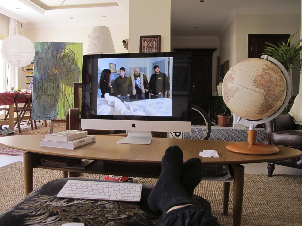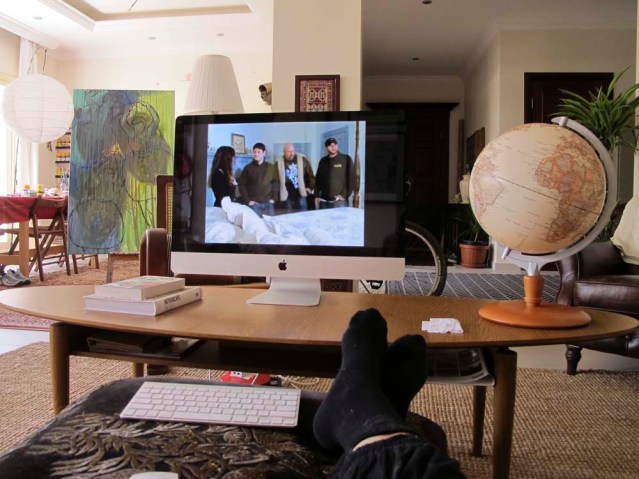 a few minor, yet fundamental, adjustments later, we were all set. soon, the mouse ended up on my belly. what a lazy ramadan. oh and ps, my socks aren't dirty, that's just the fuzz off the rug. hi jason, grant and steve!