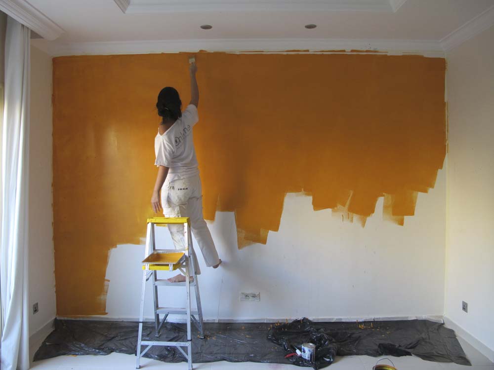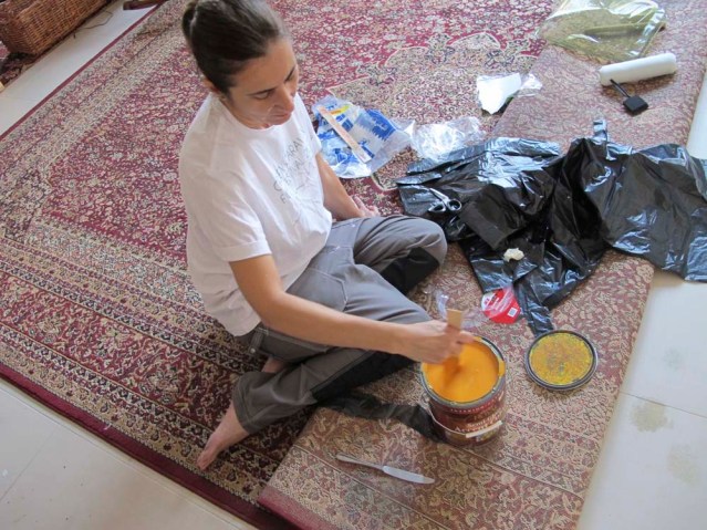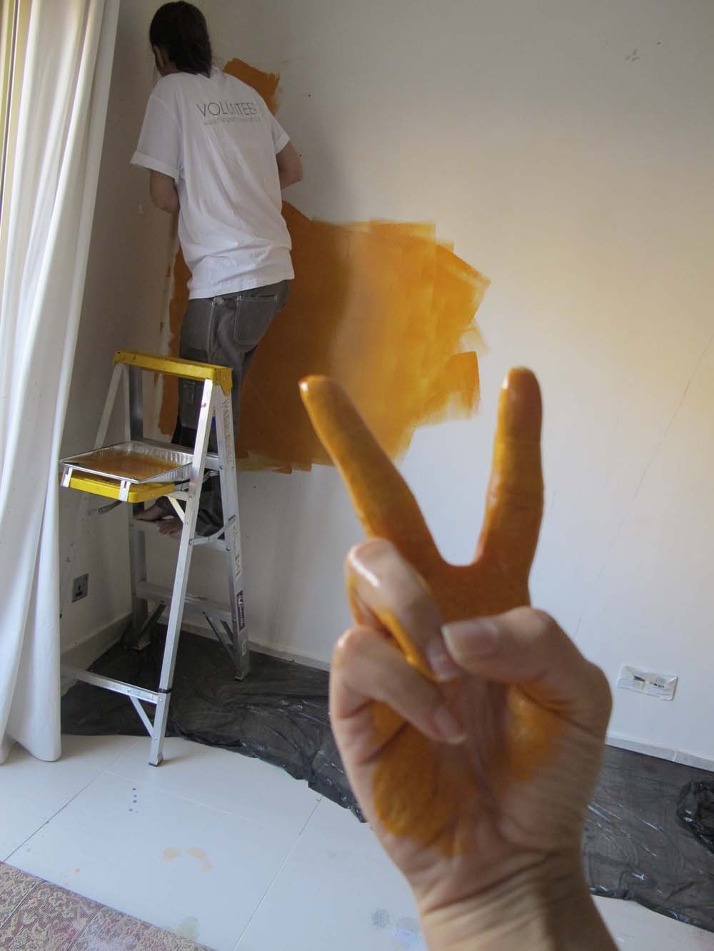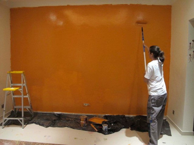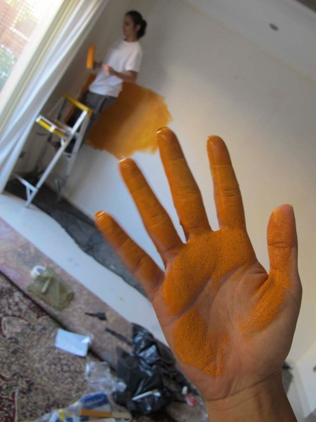 Today I started an ambitious project to get this section of my studio/home clutter-free. Because my workplace is more a home where I work than a studio I live in, I don’t like looking at this wall. So I solicited my sister Yasmine, who works at IKEA and has a good eye for interior detail. Oh, and she also happens to have a university degree in Interior Design. So the first thing on our ‘to do’ list was to paint the wall. I got her to do all the dirty bits while I splish-sploshed the wall in Thai Gold. What are little sisters for?