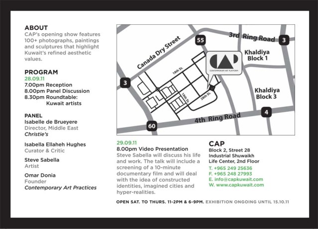 I think this is going to be one of the most exciting events of the year, if only for the birth of a new Kuwaiti hub for the contemporary arts. I’m not going to be able to attend but gallery director Liane Al-Ghusain was gracious enough to let me have a sneak peak Wednesday morning, an experience I will definitely be sharing with you guys. Good luck, Liane!