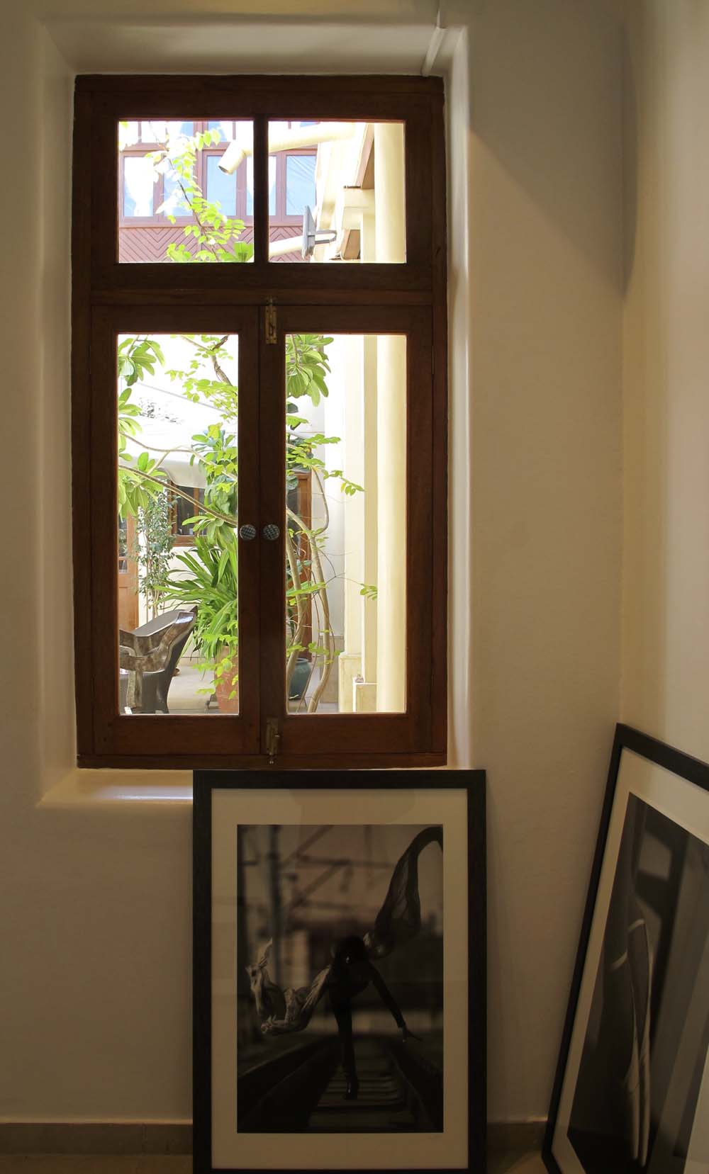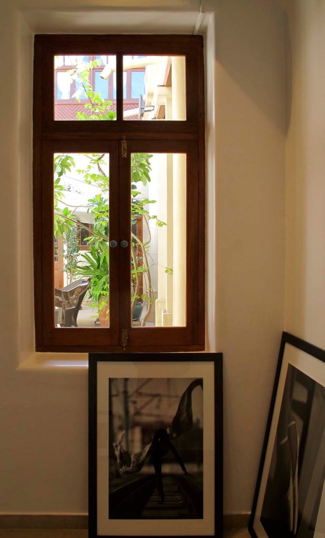 two of albassam's photographs recline as the day continues to be beautiful in the courtyard outside this window