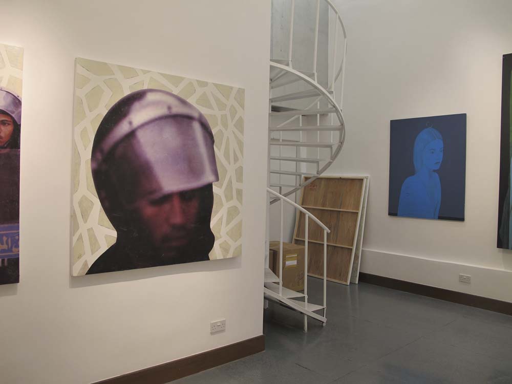 Next it was a fruitless journey to a new exhibition hall in Salhiya, Al-Mashriq Gallery. It was closed, so to console ourselves we bought some newspapers and magazines from the Kuwait Bookshop across the street. After that we took a heavily-detoured trip to Dar Al-Funoon for a sneak peak at photographer Bader Al-Bassam’s work (next post!). Finally, it was to the FA Gallery by the Amiri Hospital for their exhibition Familiar Features..Between Reality and Myth. We met up with Abed El Kadiri for a quick chat about the works and his newborn son (who looks like his beautiful mother!).