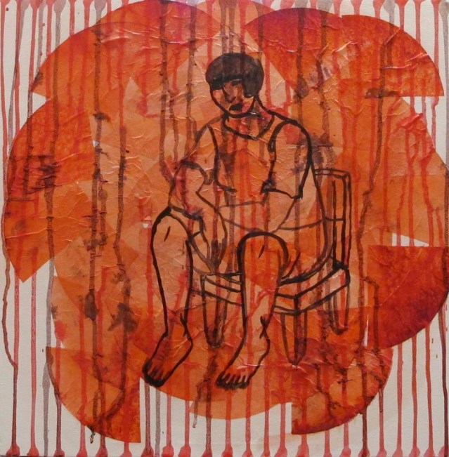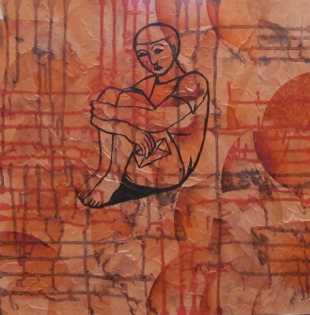 paintings about sitting: girl with letter, 2011, dyed coffee filters and acrylic on canvas, 50cm x 50cm