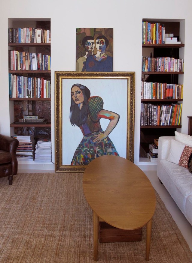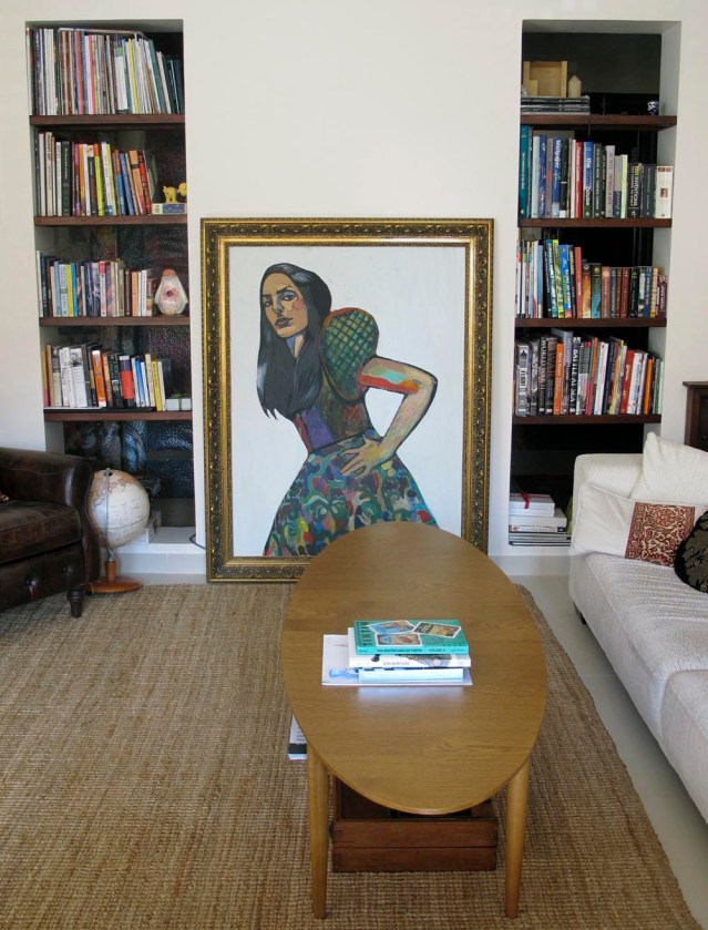 this is the way my shelves looked before (if you notice in the first photo, i have added a painting; that empty space has been gnawing at me for eons