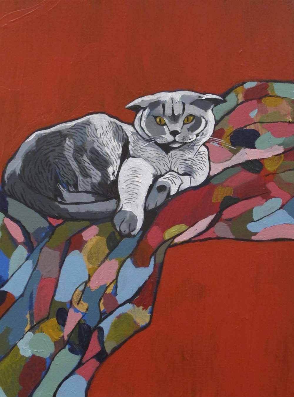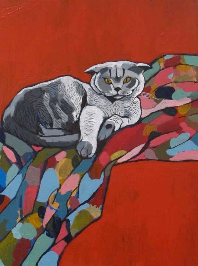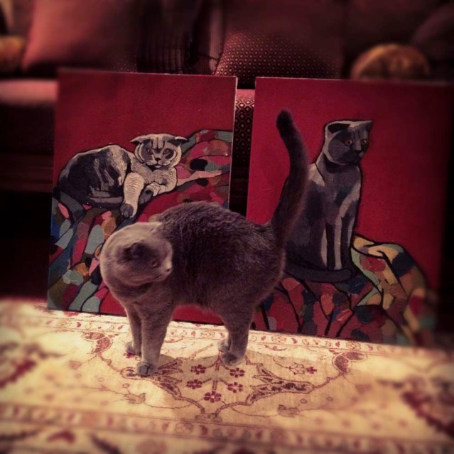 I have been wanting to give my parents a house-warming gift for ages, so my mom asked me if I could create two paintings for a specific area in their new mountain home in Beirut. She had a few guidelines for me, one of which was ‘no people’, which is like asking McDonald’s not to serve burgers. She said that my dad had already purchased two figurative paintings from a local artist and wanted something different. So with challenge in hand, I thought of oranges, apples, furniture, eggs, and even Persian rugs. But I finally settled on Nabooly the family cat. He’s a gorgeous Scottish-Fold who sits around the house doing nothing all day (still life?). Plus, I felt I could sneak some people-like features into his face and expression. My parents haven’t seen the paintings yet so I’m deeply hoping they like them.