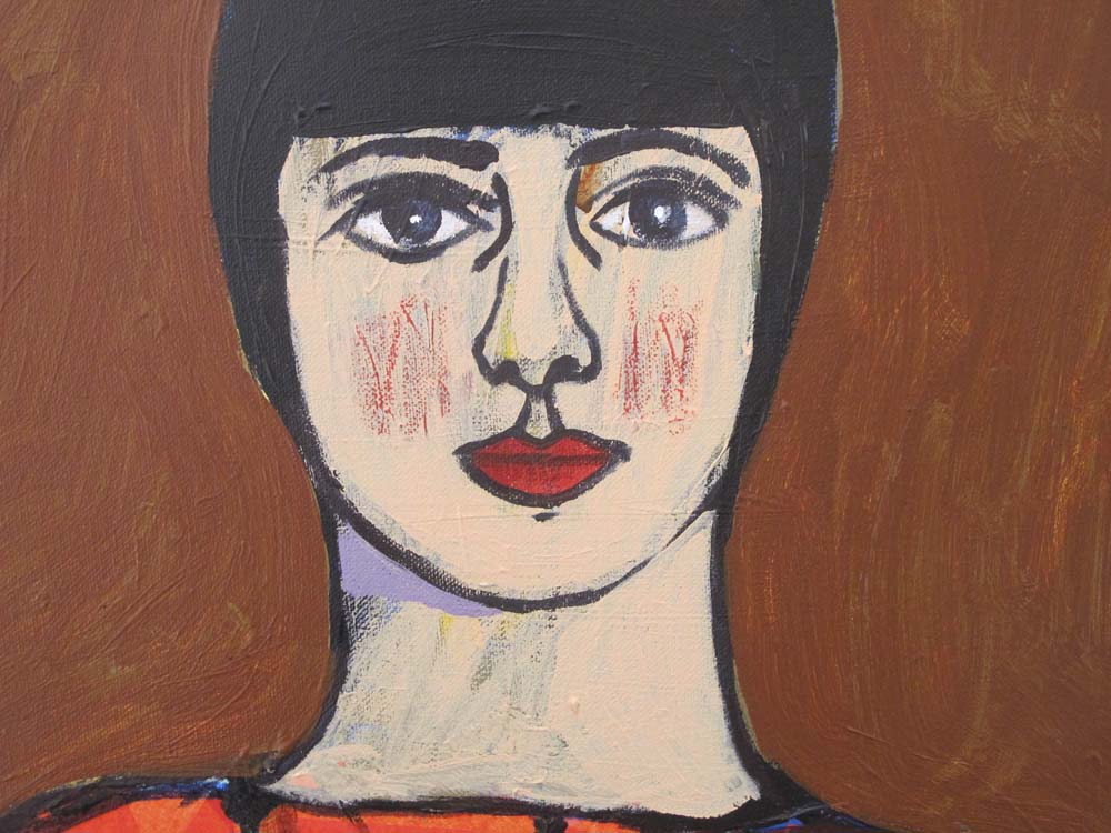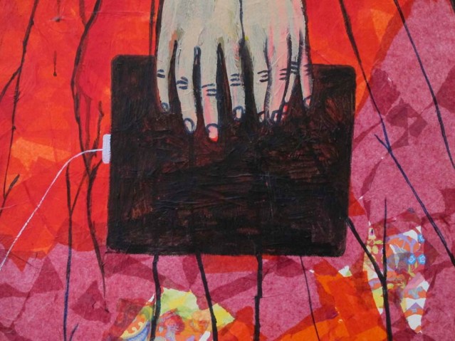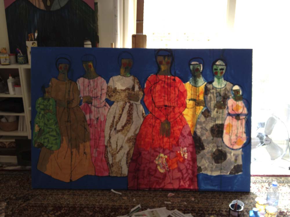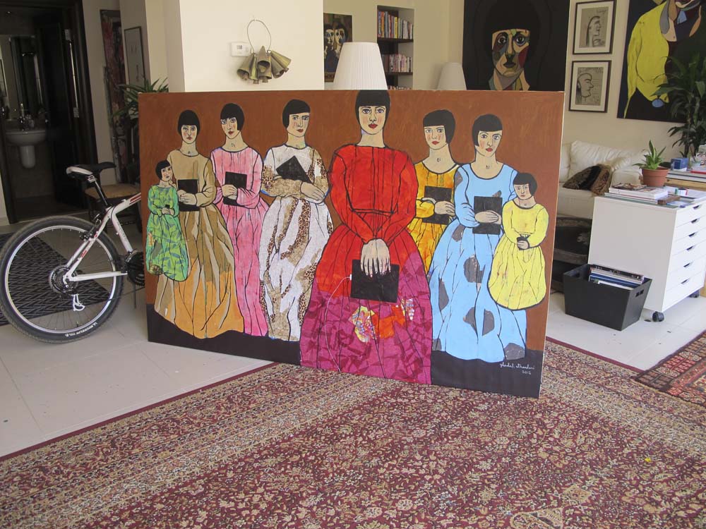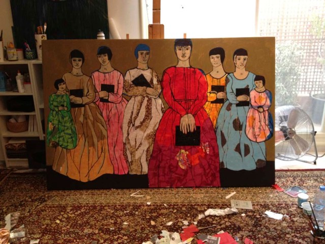 Ten days ago, I was asked to do a very special piece for five special women who wanted to gift a painting to their mama for Mother’s Day (March 21st). I met with two of the sisters who gave me a lowdown of what their mother is like and what she likes. She likes gathering her family around her. She likes being independent. And she likes technology. And Apple. And iPads. I wanted to personalize the painting further with an incarnation of Eve for each of the women who are closest to the mother: that’s the mother herself, her five daughters, and the two grand-daughters on either side of the painting. I haven’t titled this work. I felt it would have been too presumptuous to give it a title, that maybe it should be named by the woman it was gifted to.