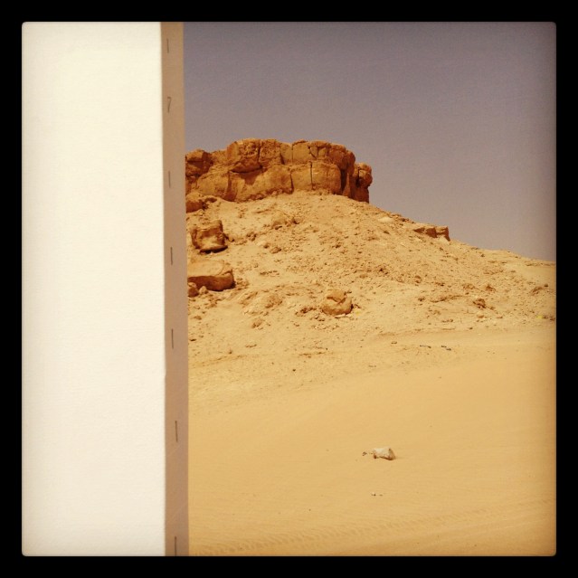 This morning, two film-makers, two curators and two artists headed off to the Mutla’a desert to film a teaser for an upcoming Gulf landscape exhibition organized by the British Council and, in Kuwait, the Contemporary Art Platform (CAP). So this morning, Hamad Khalaf (artist #1) and I (artist #2) met with Alia Farid and Liane Al-Ghusain (CAP) and film-makers Nawaf Alali (Nawaf #1) and Shaheen (Nawaf #2 [we were confused too]), and drove off to the North for an afternoon of non-stop painting, spray-painting, collecting desert debris, filming and eating yummy sandwiches (thanks, Liane’s mom!).