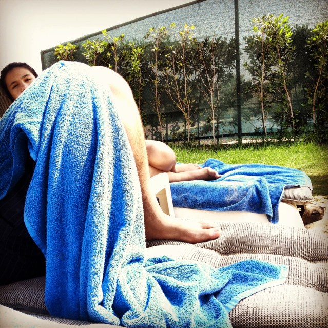 I want to just add one more thing. The dinner: mediocre. The bill: sky-high. I honestly thought it was in another currency. It was the one time that I truly felt I was travelling. Let me just say that it nearly hit the three digit mark, for six people, one of which was charged half-price for being under twelve . I want to state, and for you to be my witnesses and remind me if I ever mention going again, that I was so disappointed with the hotel (stained, crooked lamps, dirty-looking floors, no towels, no shampoo, ripped carpet, linens, shoddy blinds, curtains). It just seemed to me that there was a disconnection between the main hotel and the chalets. I’m sure it’s difficult to maintain beachfront property, but come on! This is the Hilton. Well, where we stayed last night, that was not Hilton. It just wasn’t. Two big, fat pluses though: the bed was absolutely comfy and the towels were gigantic and fluffy.