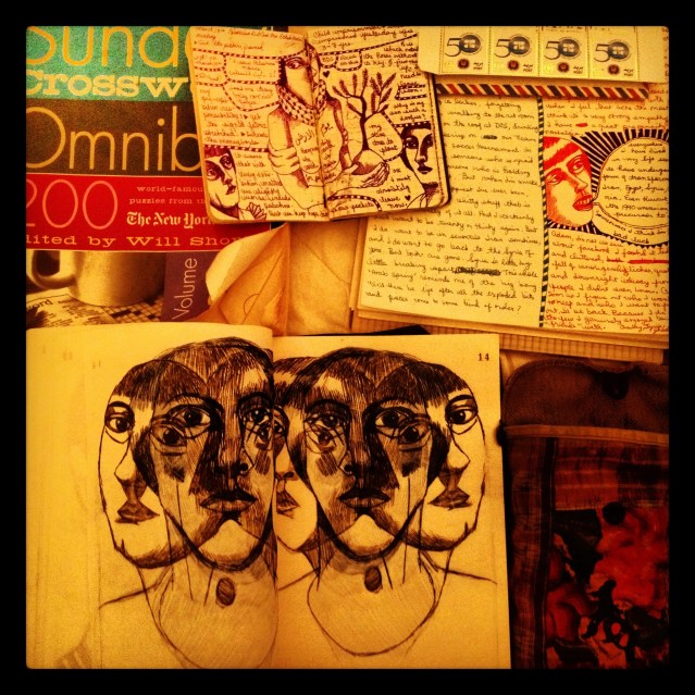 crossword puzzle, planning and sketchbooks are a must. as is my pencil/pen case. a clipboard always comes in handy too for writing letters to the non-desert islanders
