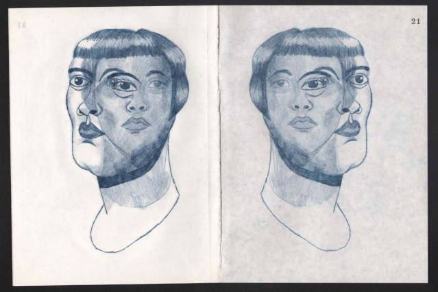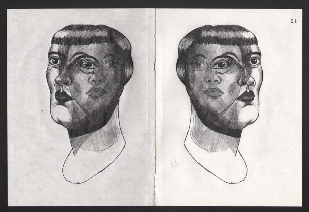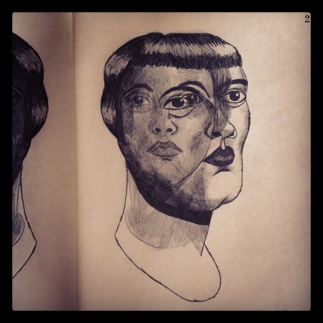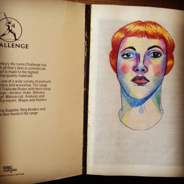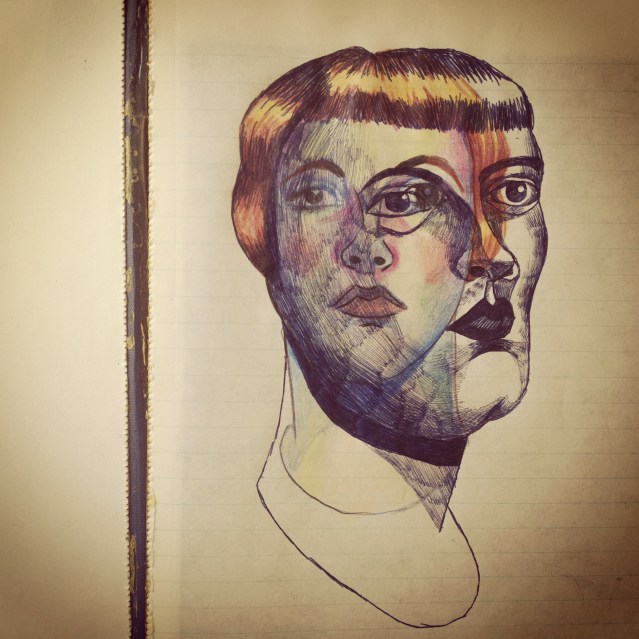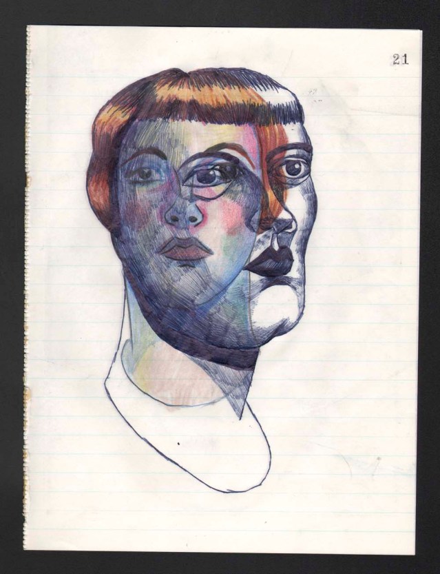 face in bust original in pencil colors and pen. i think you may notice that my triplicate book has come apart, which i find far more appealing now