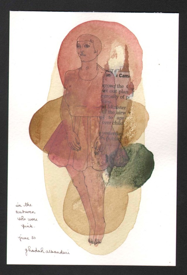 Category: Cut & Paste, Postcards, PrettyGreenBullet } TheThirdExhibition, Watercolor Tags: autumn, collage, cut and paste, fall, figure, ink, Kuwait, newspaper, pink, postcard, Postcards, rust, watercolor, woman