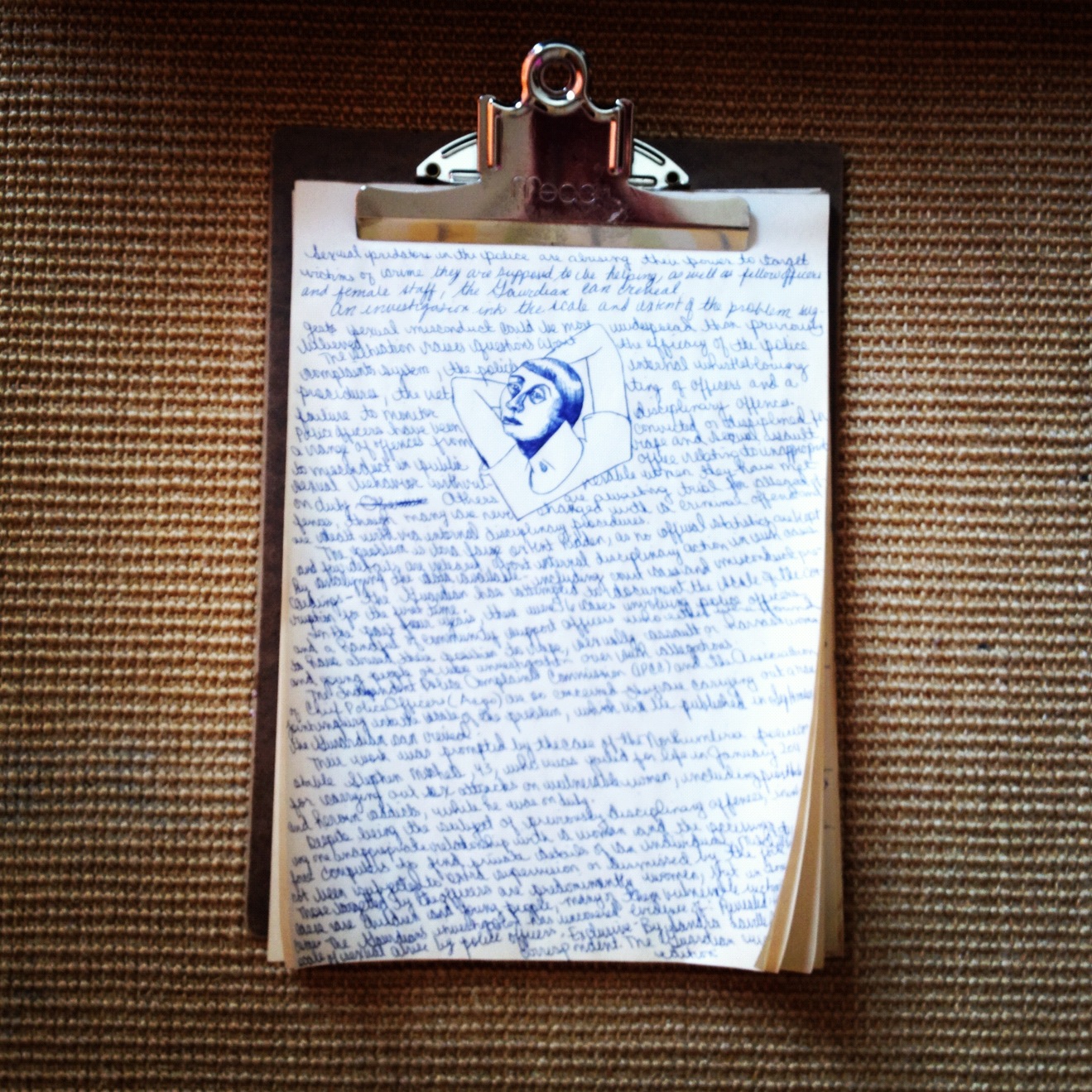 when you get a strong, physical urge to write while completely relaxing your mind, you resort to being dictated to. in this instance by ‘the guardian’ newspaper. i just transfered part of an article using a blue bic pen onto this wonderful newsprint notepad. i regard it as another form of painting from life, but i’m drawing the words for what they are rather than writing them for what they mean. and a big part of the exercise is the fact that the pen writes so nicely on this paper, and the paper reacts so well to the ink, developing a noticeable crinkle by the end.