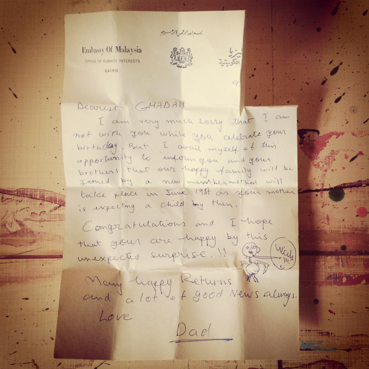 this is the letter; a ‘birthday gift’ to me. it was written on a blue sheet of official embassy paper. notice it’s the embassy of malaysia and not kuwait. back then, kuwait and egypt did not have official diplomatic ties because of egypt’s peace accord with israel, so we were disguised as malaysians!