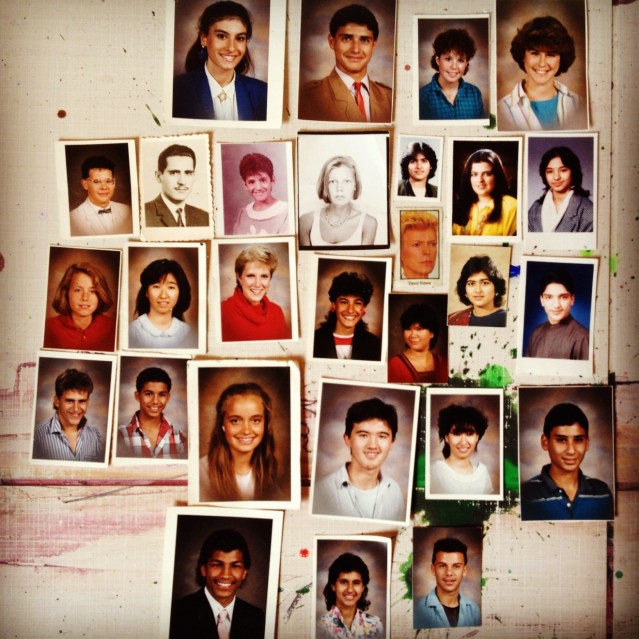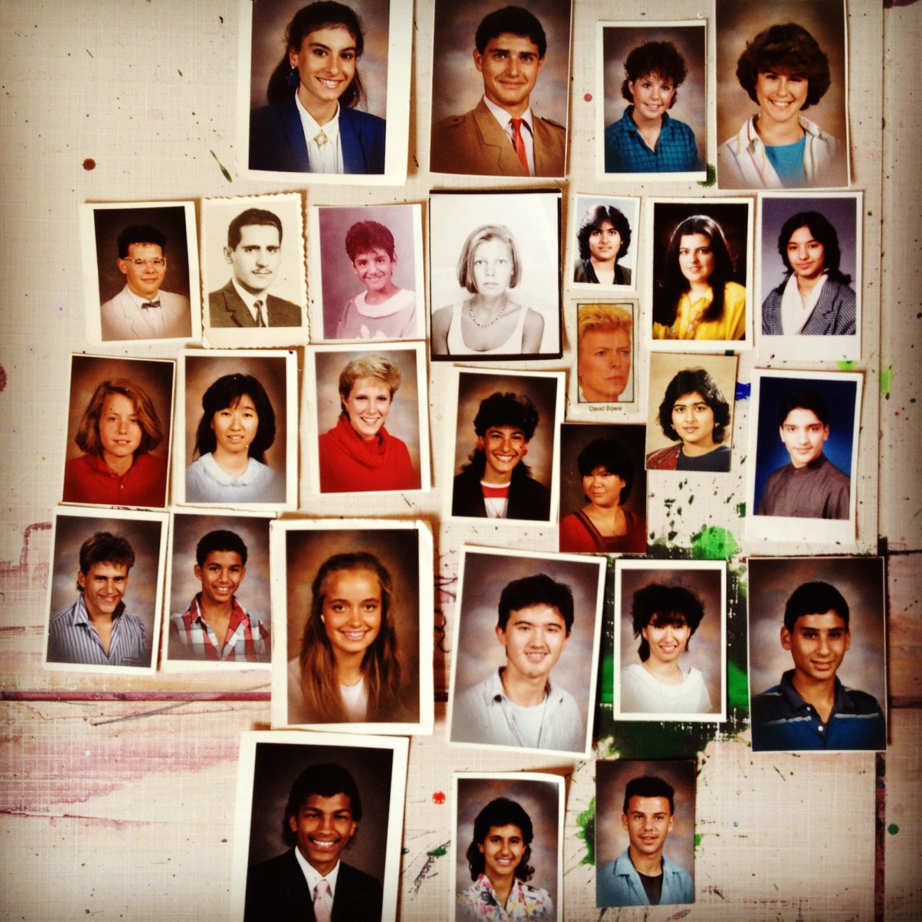 school photos of friends and various other people in my life (yes, bowie too). this is all i had. i’m sure most kids had way more than this. and this was over a couple of years. let’s just say i was highly selective (actually many of these people were just acquaintances). cathy is on the top right hand corner