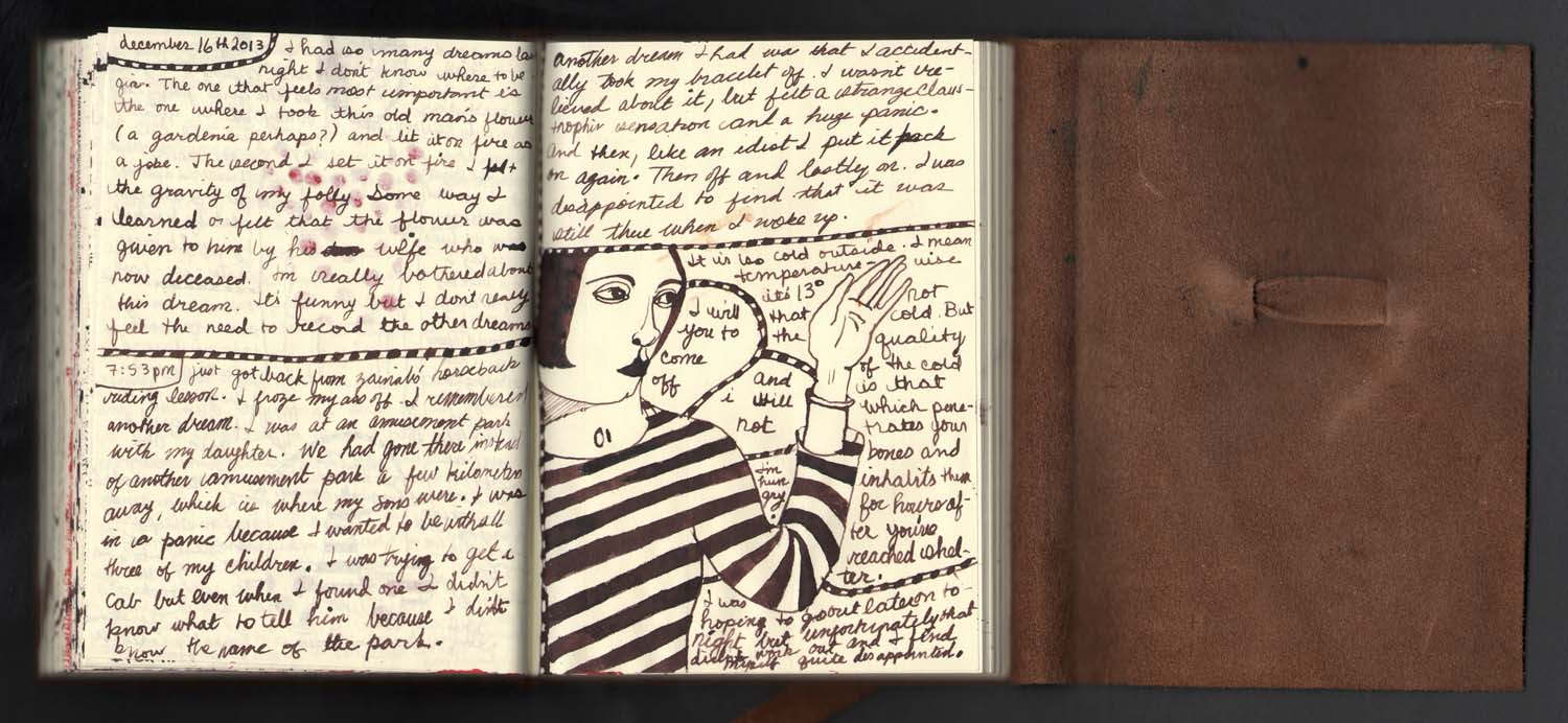 Category: The Brand New & Improved Testament Tags: art, brown, diary, drawing, ink, journal, Kuwait, leather, notebook, penmanship, script, sketch, stripes, writing