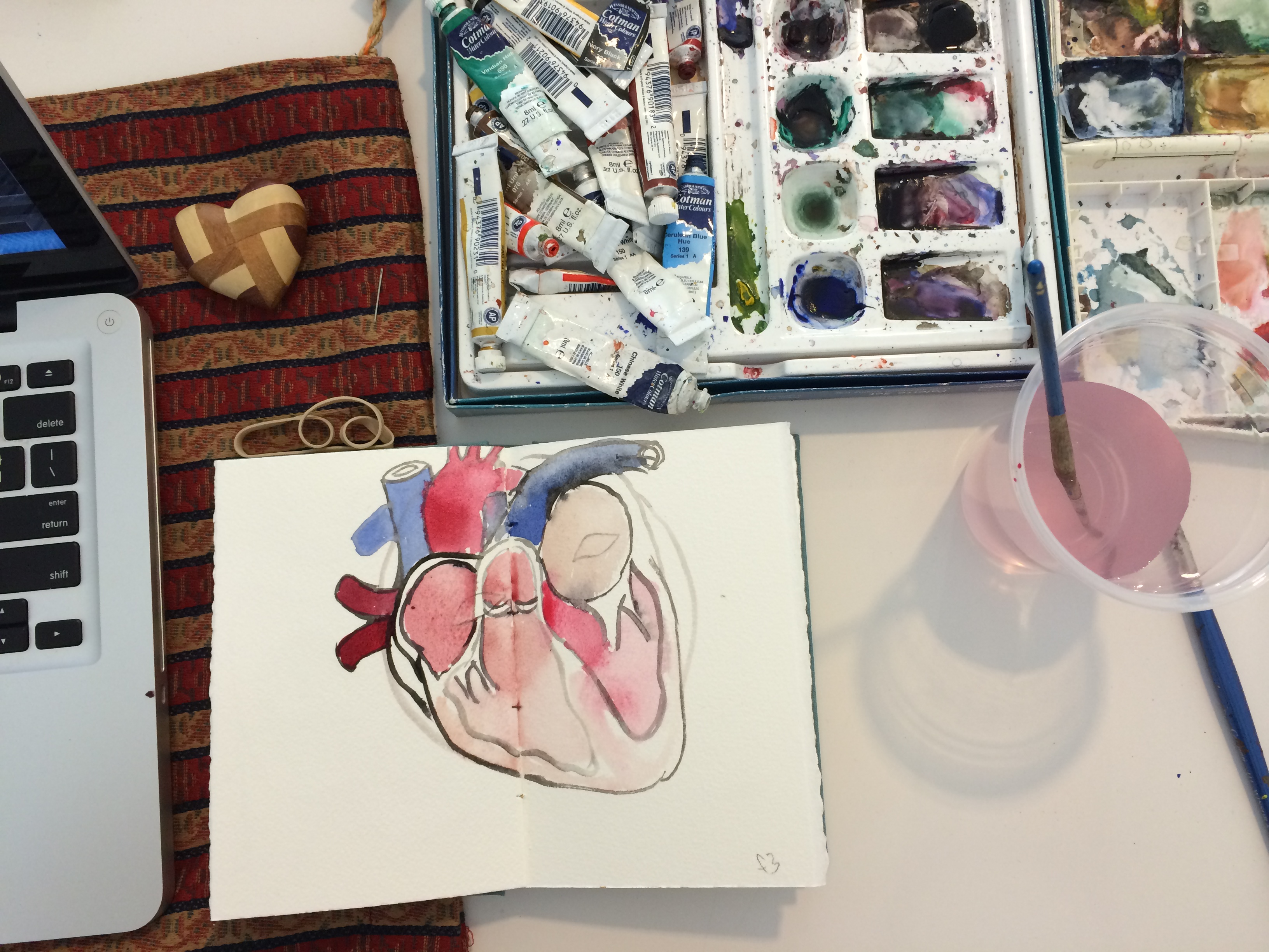 the rubber band reminded me of a heart, which made me look at the wooden heart my son yousef gave me, which made me draw a heart-shaped face that turned into a heart