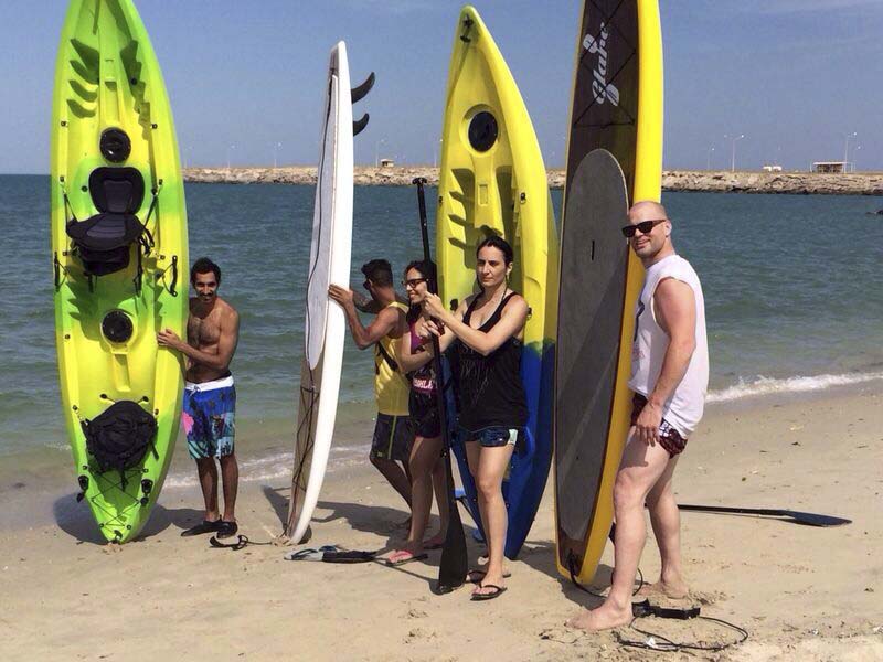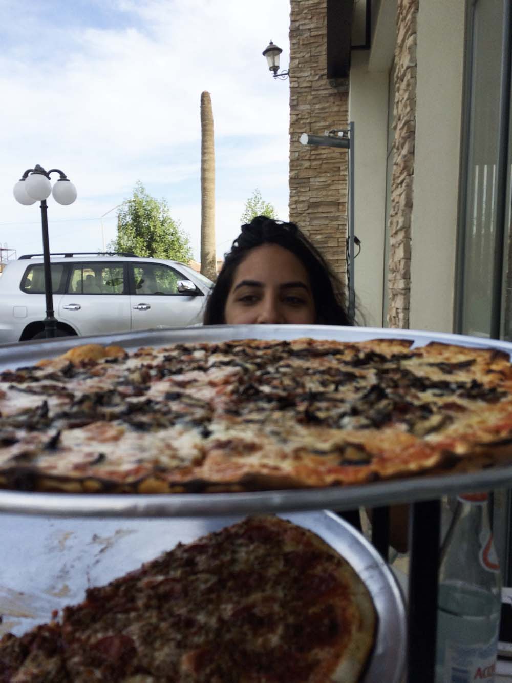 my view at lunch: yasmine, two giant pizzas, and a frondless palm