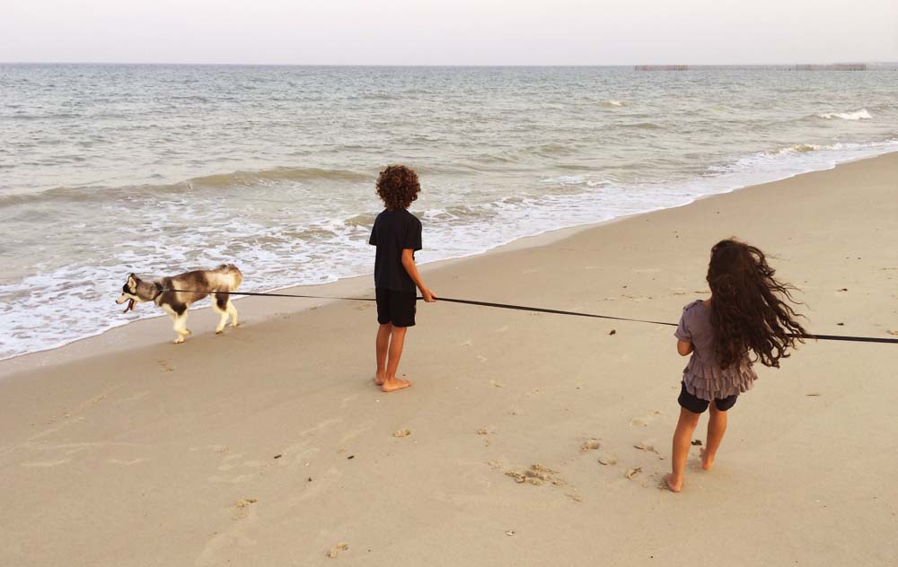 kiki and yousef play tug of war with rocko the sheered husky