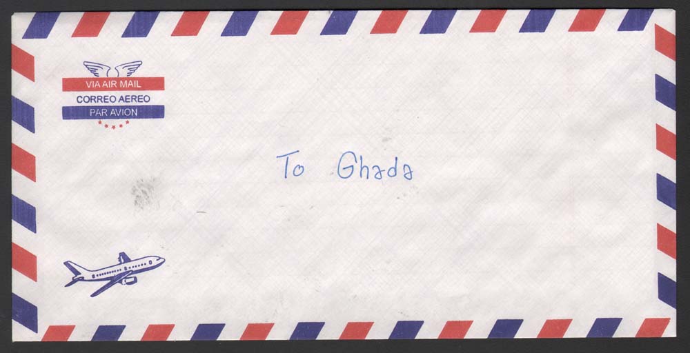 fatma abdulsalam. rectangular envelope par avion, with airplane. Sealed (licked). Addressed to: awesome great ghadah (love heart)