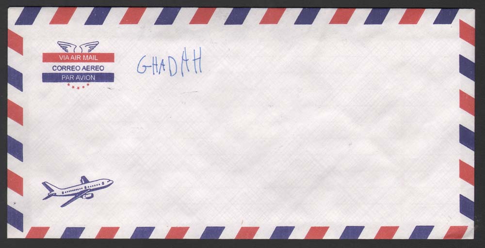fatima alzahraa ahmad abodomoma. rectangular envelope par avion, with airplane. envelope unsealed. addressed to: ghada al kandri