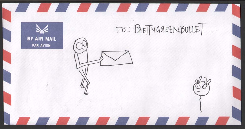 deena machina. rectangular envelope par avion, no airplane. envelope sealed (sticker, not licked). addressed to: prettygreenbullet (backwards r’s). two doodles
