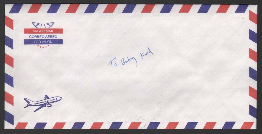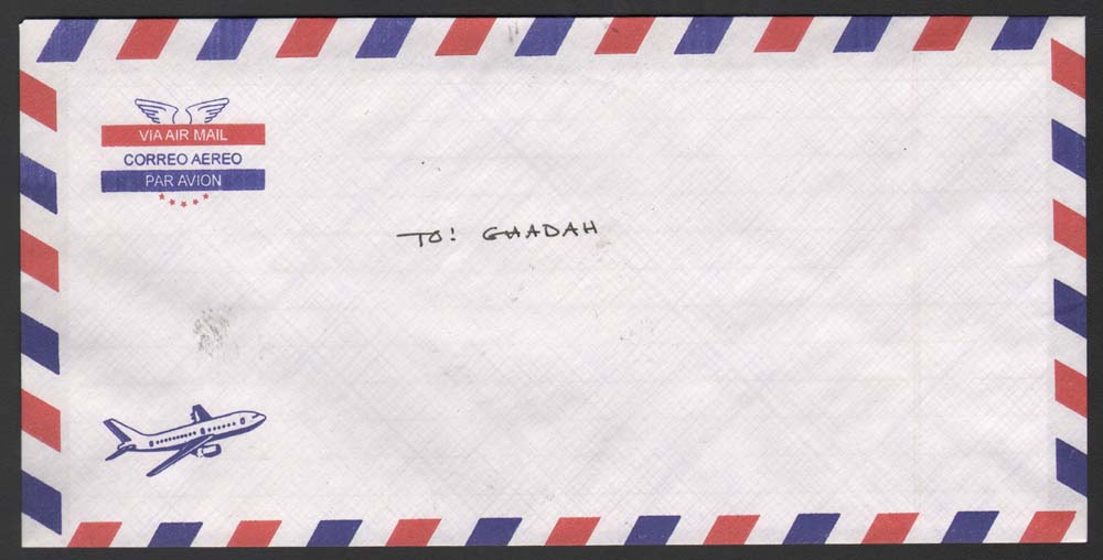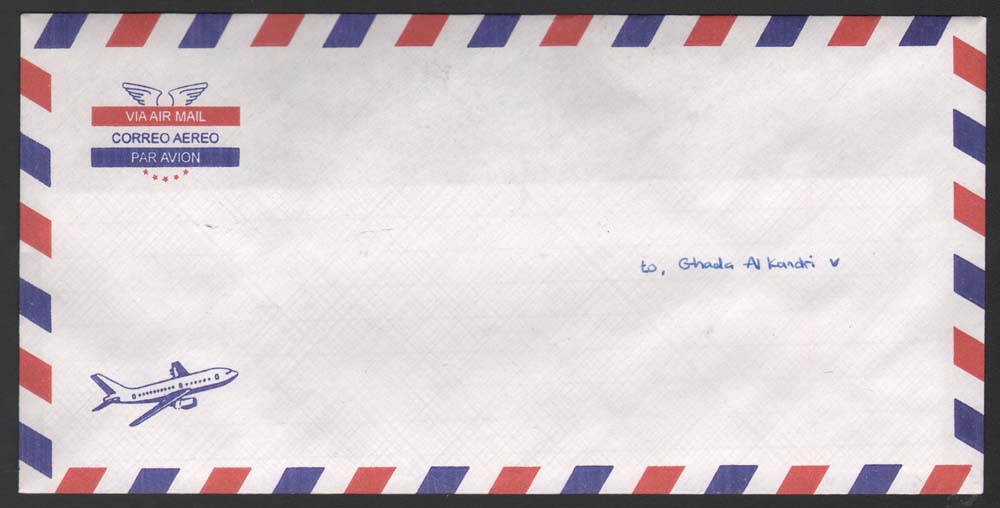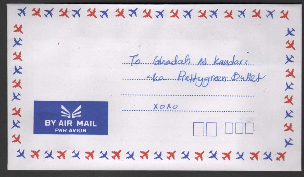 shareefa abdulsalam. small rectangular envelope par avion. sealed (licked). addressed to: ghadah al kandari aka prettygreen bullet xoxo