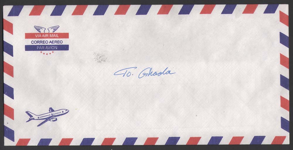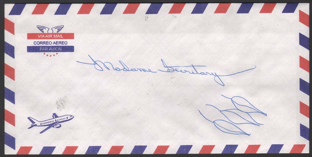 lubna saif abbas. rectangular envelope par avion, with airplane. sealed (licked). addressed to: madame secretary. one doodle