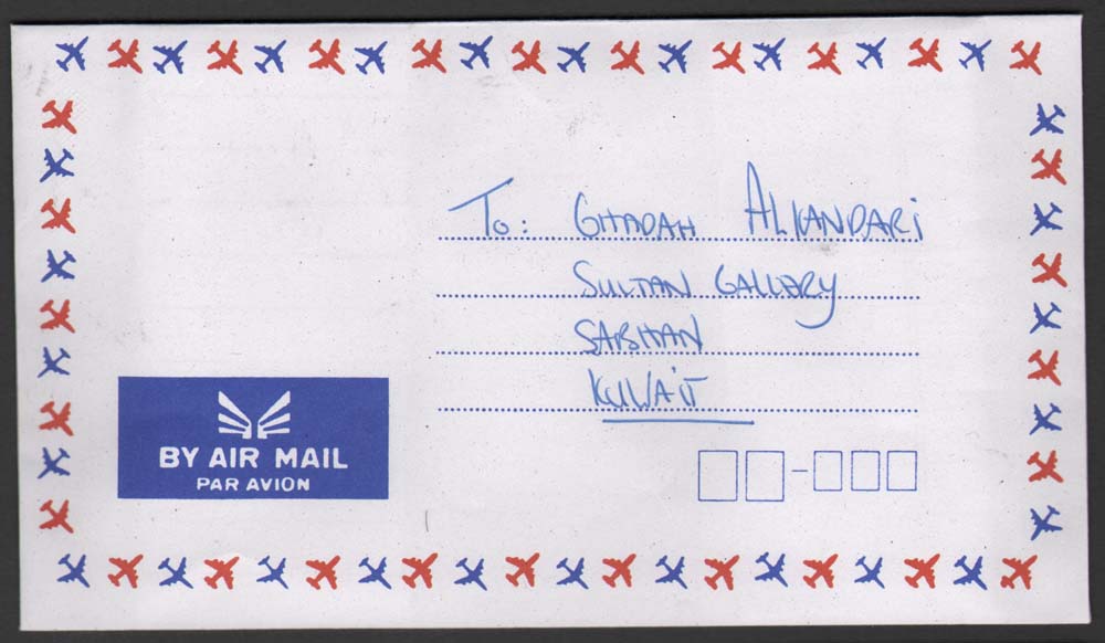 mai al-nakib. small rectangular envelope par avion. sealed (licked). addressed to: ghadah alkandari, sultan gallery, sabhan, kuwait