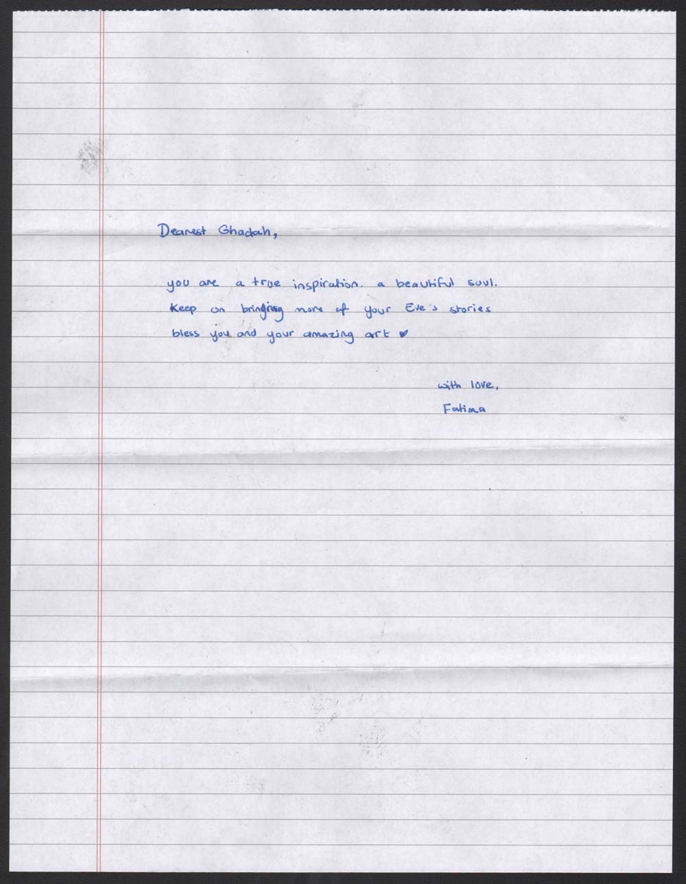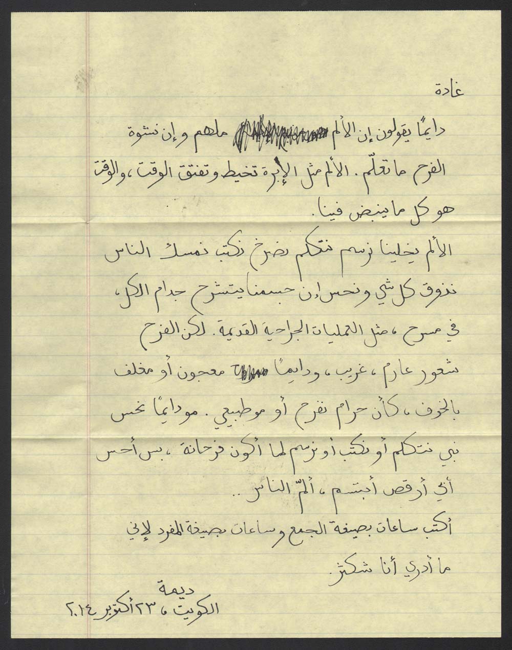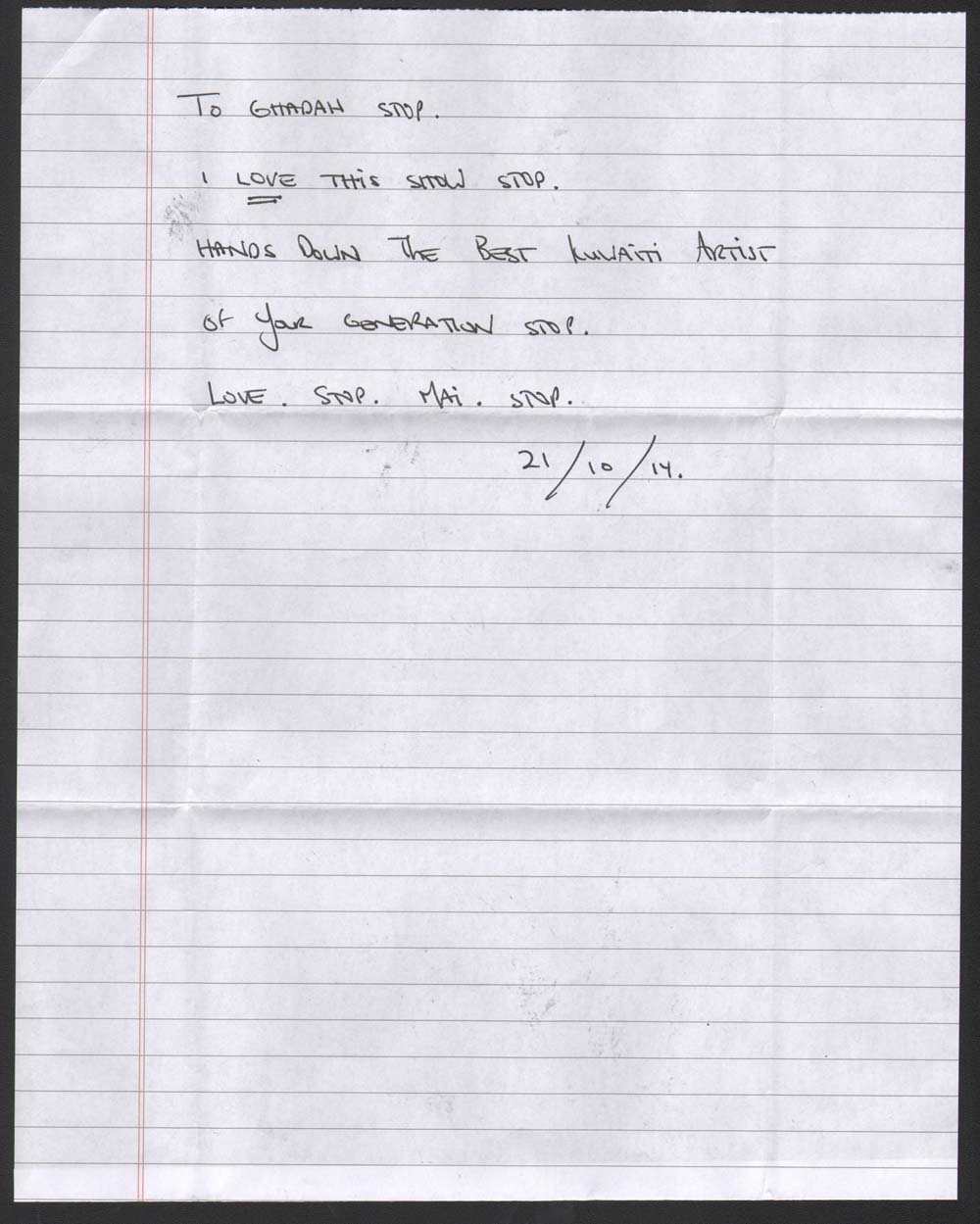 deema alghunaim. white envelope. sealed (licked). transliterated from arabic: yussalam liyed ghadah alkandari (to be placed in ghadah alkandari’s hand)