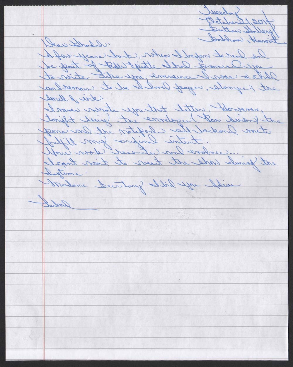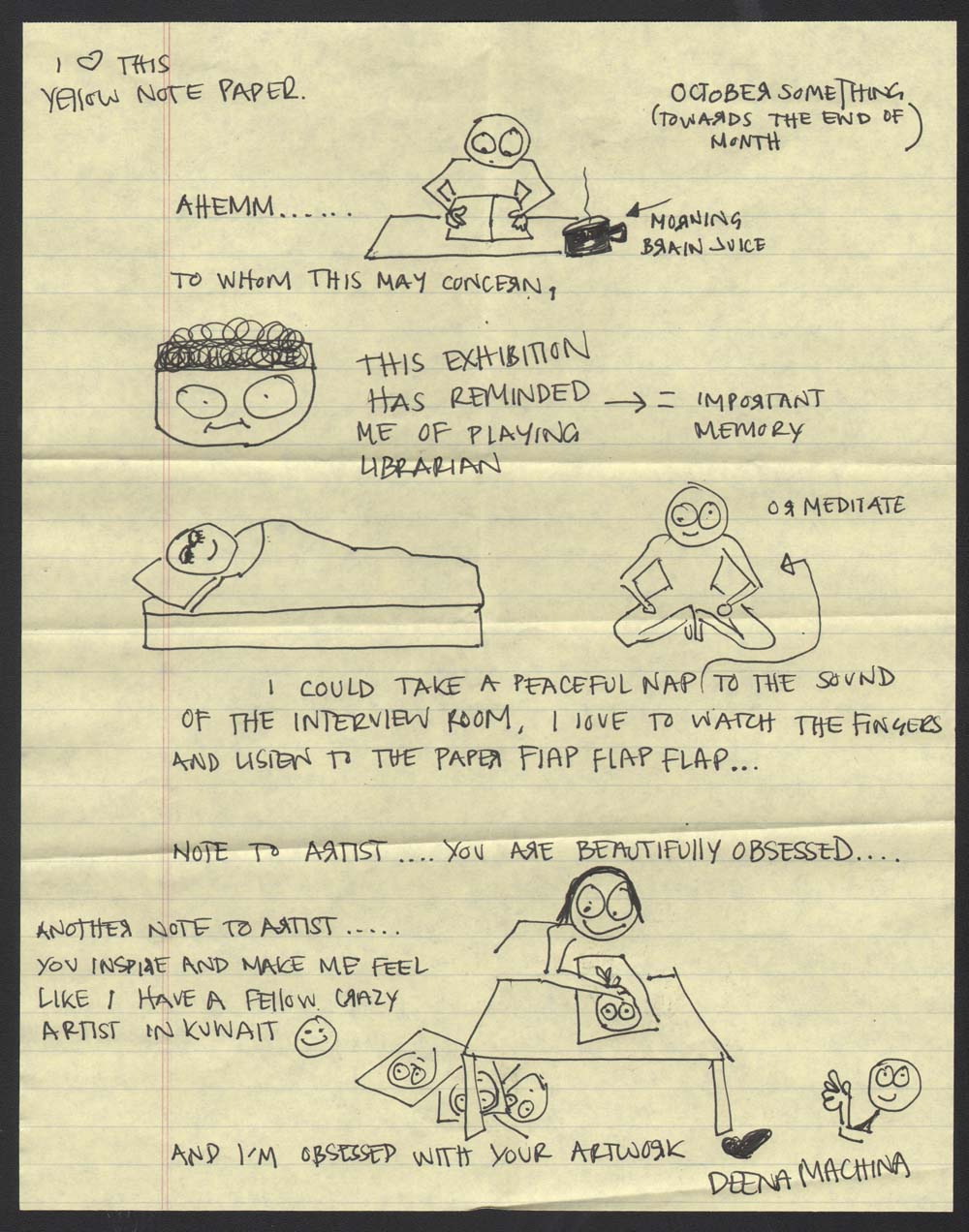 Secretary #11: Deema Alghunaim. Ms. Alghunaim wrote a wonderful letter in Arabic. My favorite line: I write as single and I write as a plural, because I do not know how many I am. Believe me, it sounds tons times better in Arabic. She included location and date. She wrote on the yellow paper. The letter is folded into six unequal parts.