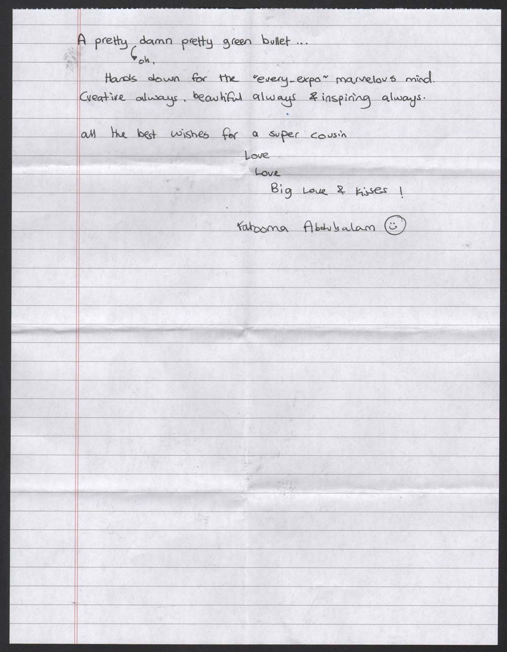 Secretary #15: Laila Al-hamad. Ms. Al-hamad included a lovely story about her teacher Ms. Al Qabandi in her letter. She wrote in cursive and only once ignored the left margin. She included the date on the top right-hand corner and closed her letter with two kisses. She folded her letter into teeny tiny segments. Hers was the most difficult letter to re-fold.