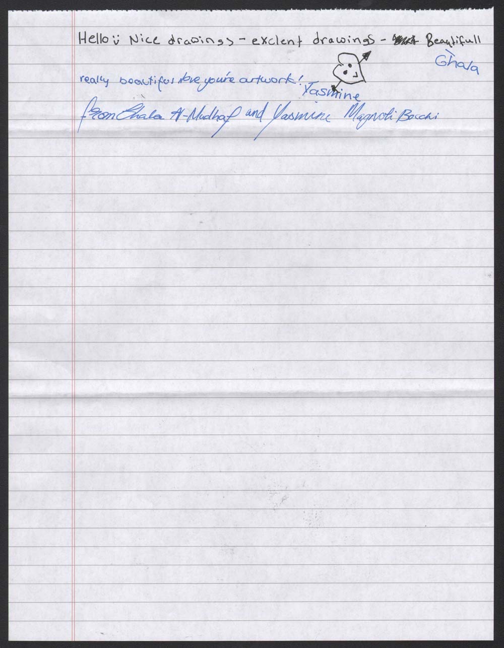 Secretaries #12 & #13: Ghala Al Mudhaf & Yasmine Magnoli Bocchi. Ms. Al Mudhaf and Ms. Bocchi used blue and black to write. It seems that one girl signed off for both so we must work on that. One of them drew a smiley face heart and arrow. Only one margin was respected. The Hello is very friendly and keeps things casual.