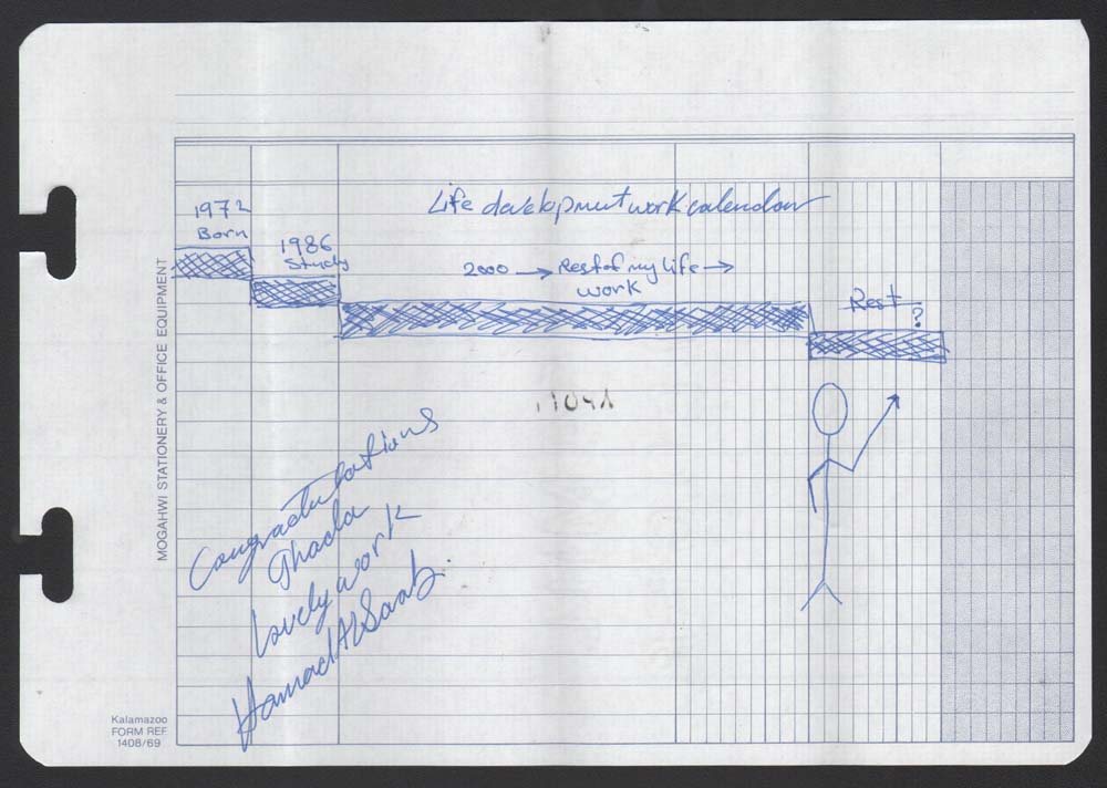 Secretary #7: Hamad Al Saab. Mr. Al Saab used paper from the neighboring installation. Which is OK and secretly encouraged. He has folded his letter into four segments. I’m not sure his chart makes sense, but we can work on that.