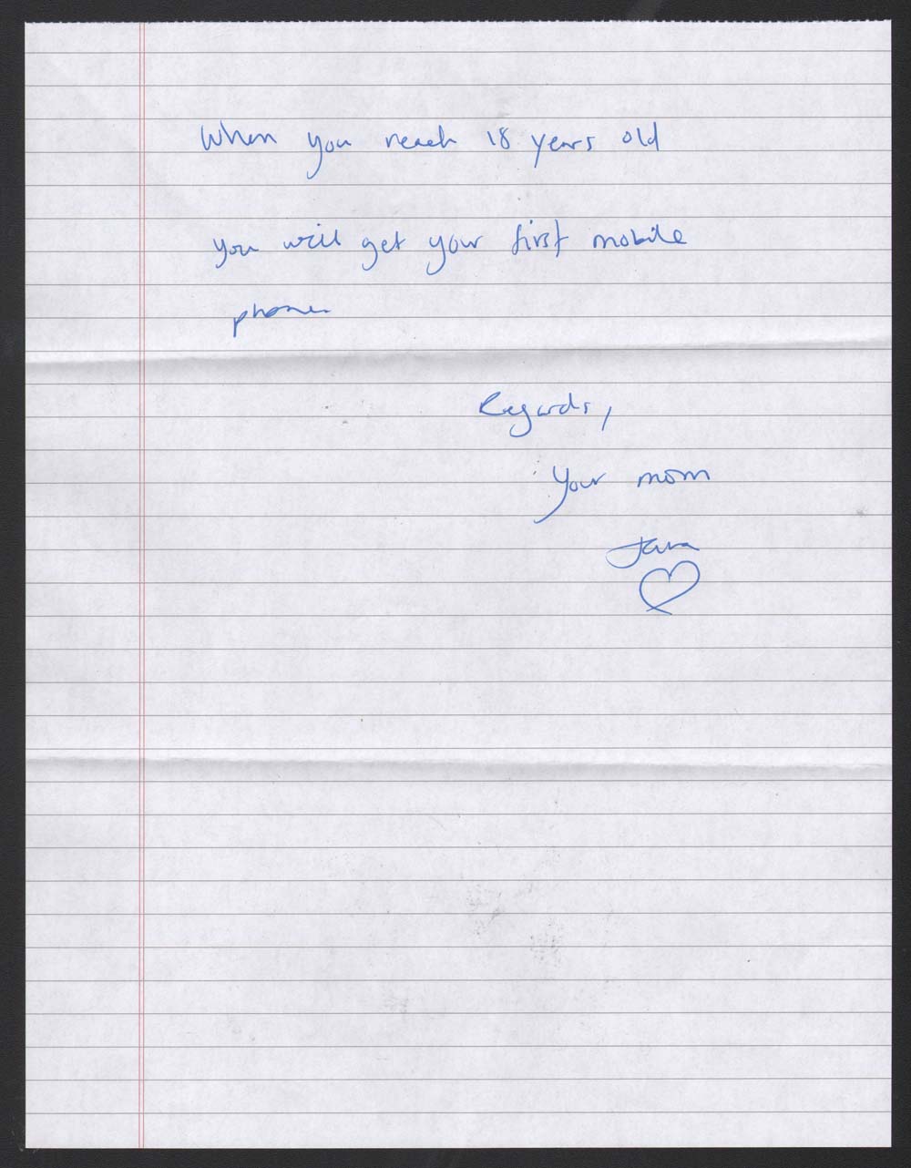 Secretary #14: Jana Alnaqeeb. Ms. Alnaqeeb wrote to her son Khaldoun, my nephew. It is either a letter of good tidings, a note of warning or a simple reminder that she will wait until he’s 18 to get him a mobile. If mobiles still exist then. She closes her letter with a formal Regards, offset by a loving heart and the phrase ‘Your mom’.