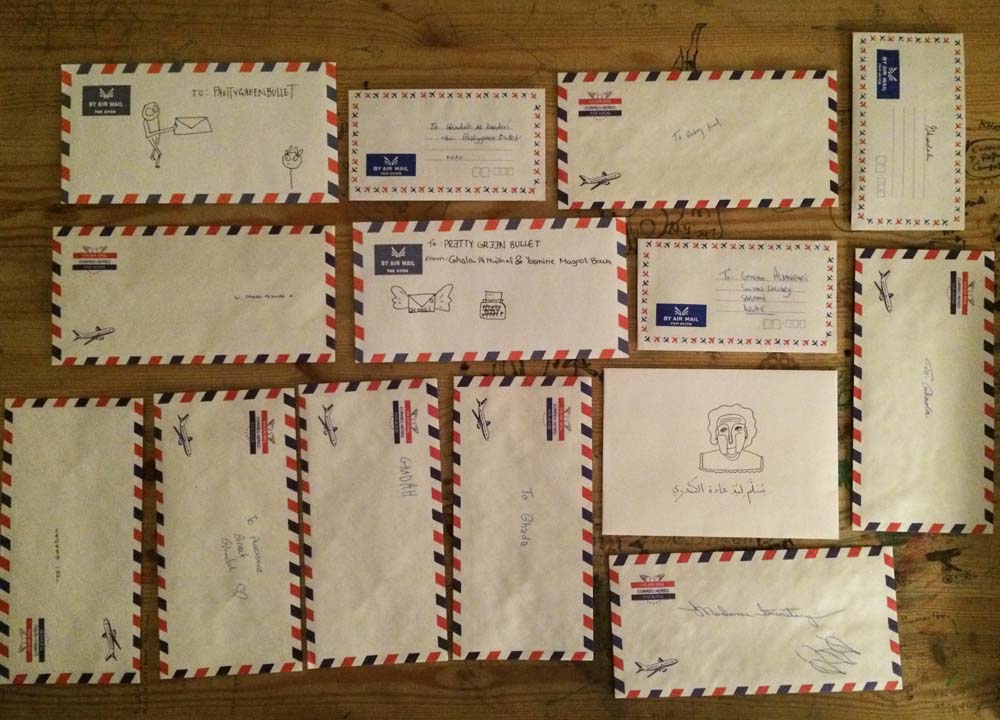ghala al mudhaf & yasmine magnoli bocchi. rectangular envelope par avion, without airplane. sealed (with sticker). addressed to: pretty green bullet (backwards e’s, except for one). two doodles