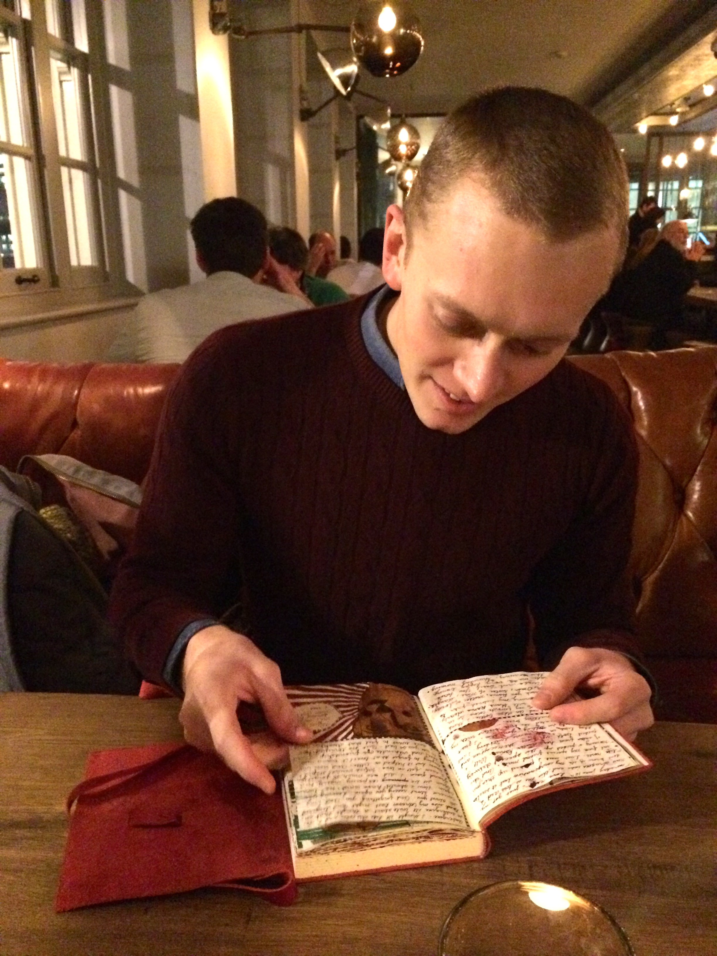 robert (or rob, bob or bobby) flips through my journal at the swan pub near shakespeare’s globe theatre