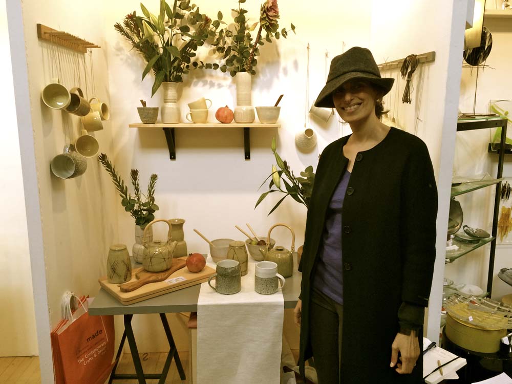 sarah in her new hat by elizabeth renton's ceramic display. it was the pomegranates that attracted our attention to this thoughtfully put-together booth